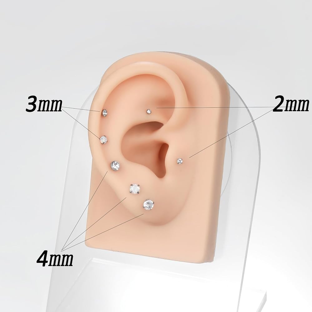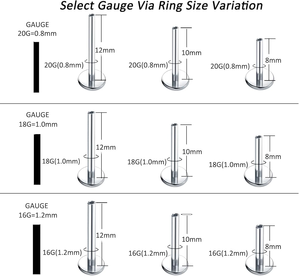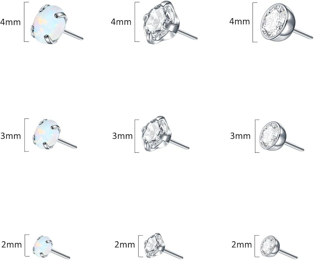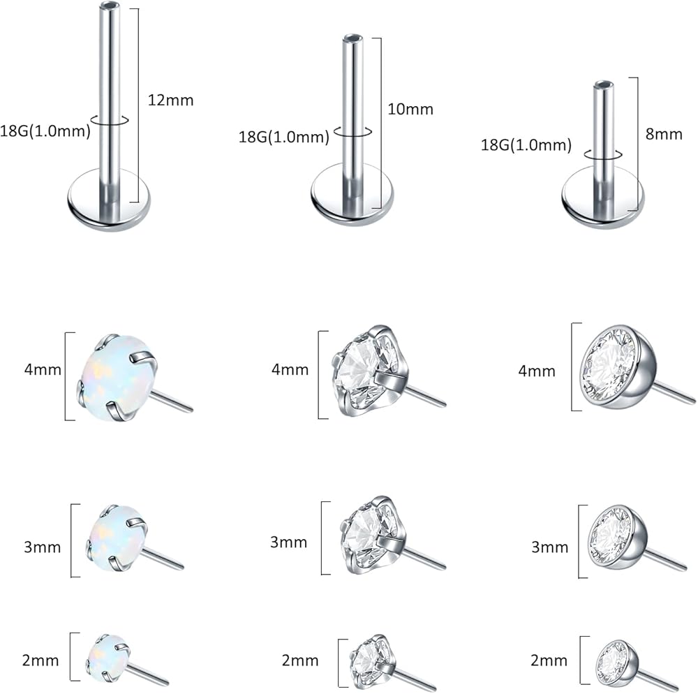 مقياس المجوهرات بدون خيوط 16 جرام؛ طول الشريط: 5/16 بوصة، 3/8 بوصة، 1/2 بوصة؛ حجم الحجر: 2 مم، 3 مم، 4 مم. يمكن استخدامها كمجوهرات غضروف 16G، لابريت، مونرو، تراجوس، هيليكس، محارة الرخ.