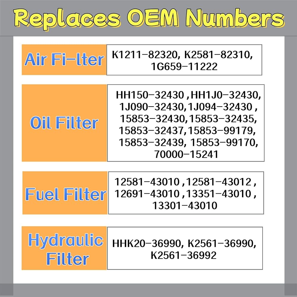 • استبدال لـ: فلتر الهواء K1211-82320، K2581-82310، 1G659-11222 فلتر الزيت HH150-32430، HH1J0-32430،1J090-32430، 1J094-32430، 15853-32430، 15853-32435،15853-32437،15853-99179، 15853-32439، 15853-99170،70000-15241 فلتر الوقود: 12581-43010، 12581-43012، 12691-43010 ،13351-43010،13301-43010 الفلتر الهيدروليكي: HHK20-36990، K2561-36990، K2561-36992