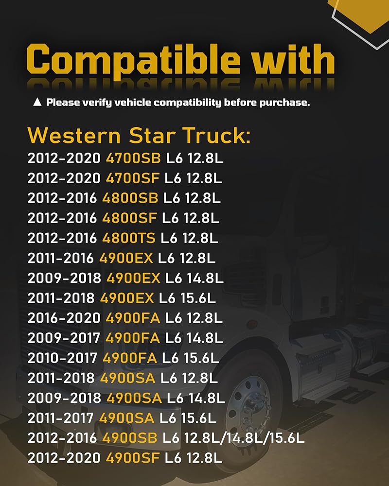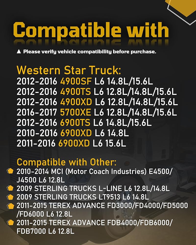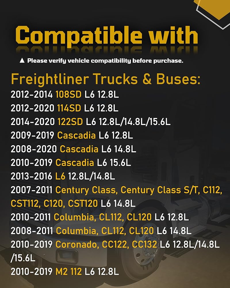 متوافق مع: فريتلاينر 2012-2020 114SD L6 12.8L، 2014-2020 122SD L6 12.8L 14.8L 15.6L، 2009-2019 كاسكاديا L6، 2010-2019 M2 112 L6 12.8L. Western Star 2012-2020 4700SB L6 12.8L، 2012-2016 4900SB L6 12.8L/14.8L/15.6L، إلخ. يرجى الرجوع إلى صفحة تفاصيل المنتج للحصول على نماذج مفصلة.