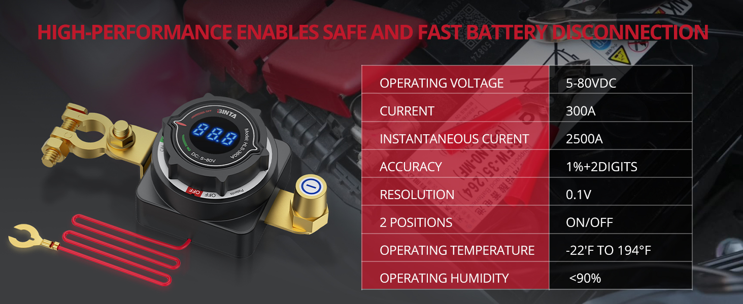 【أمان معزز ومعالجة التيار العالي】يدعم مفتاح فصل البطارية هذا تيار مستمر 5 فولت-80 فولت ويتعامل مع تيار التيار المستمر 300 أمبير/2500 أمبير. كمفتاح إيقاف موثوق للسيارة، فهو يوفر عزلًا كهربائيًا كاملاً لمنع استنزاف البطارية والحماية من الدوائر القصيرة، مما يضمن أقصى قدر من الأمان للنظام الكهربائي لسيارتك