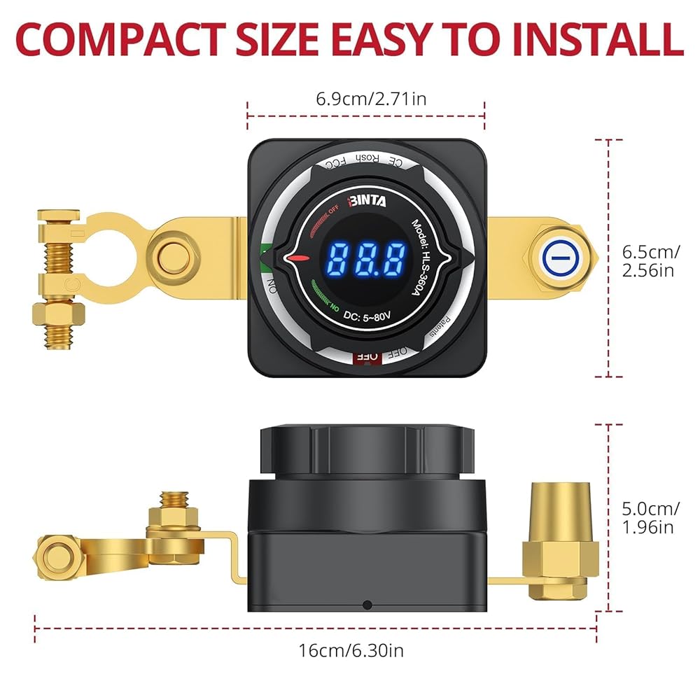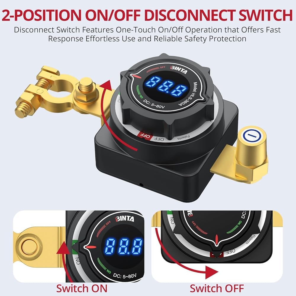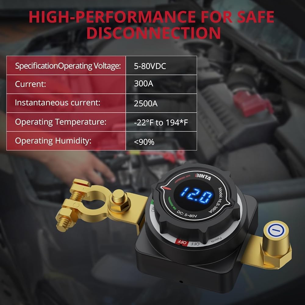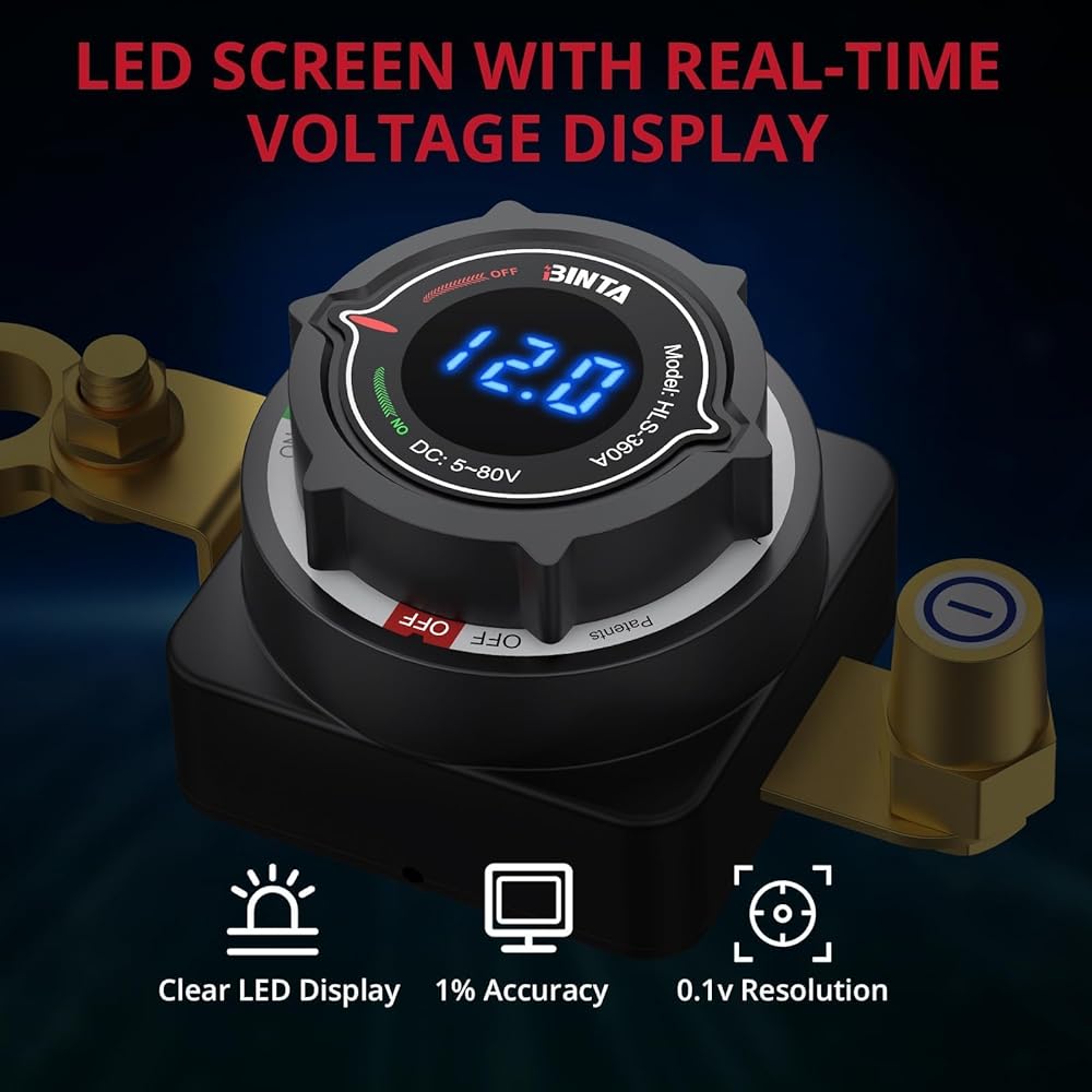 【عرض الجهد الدقيق】يتميز مفتاح قطع البطارية الخاص بنا بشاشة LED ساطعة بدقة ±1% ودقة 0.1 فولت. تتيح لك وظيفة فصل البطارية مراقبة حالة الجهد الكهربي في الوقت الفعلي في لمحة، مما يساعدك على تشخيص صحة البطارية على الفور وتجنب الأعطال غير المتوقعة أثناء الرحلات