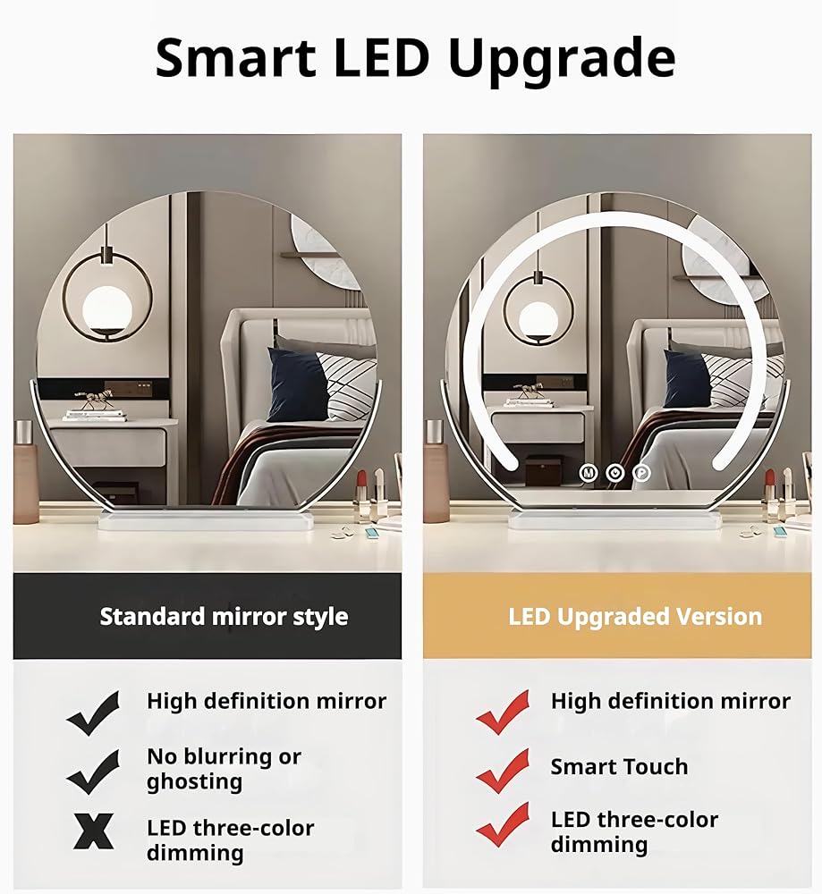 ✅ شاشة تعمل باللمس قابلة للتعتيم بثلاثة ألوان - التحكم الذكي باللمس يجعل مرآة الزينة المضيئة هذه سهلة الاستخدام. قم بالتبديل بين الإضاءة الدافئة والطبيعية والباردة لتتناسب مع البيئات المختلفة وتضمن إضاءة متساوية لكل تفاصيل مكياجك.