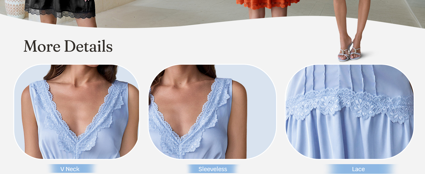 • دانتيل رائع: زخرفة من الدانتيل الرقيق تزين خط العنق والحاشية على شكل حرف V، مما ينعم الصورة الظلية ويعزز السحر الأنثوي بتفاصيل معقدة