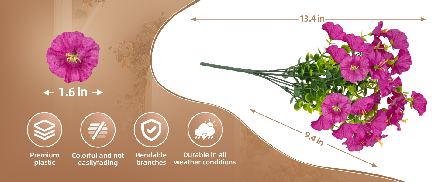 مظهر واقعي: تحاكي كل حزمة من الزهور الشكل الطبيعي لمجد الصباح، مع سيقان تشبه الأوكالبتوس وطبقات من الأوراق الخضراء المورقة. بفضل التفاصيل المعقدة والألوان النابضة بالحياة والتشبع الغني، فهو يمزج بشكل جميل بين السحر الطبيعي والأسلوب المعاصر. سواء في الداخل أو الخارج، فإنها تجلب حيوية طبيعية أبدية، مما يحافظ على مساحتك الربيعية طوال العام.