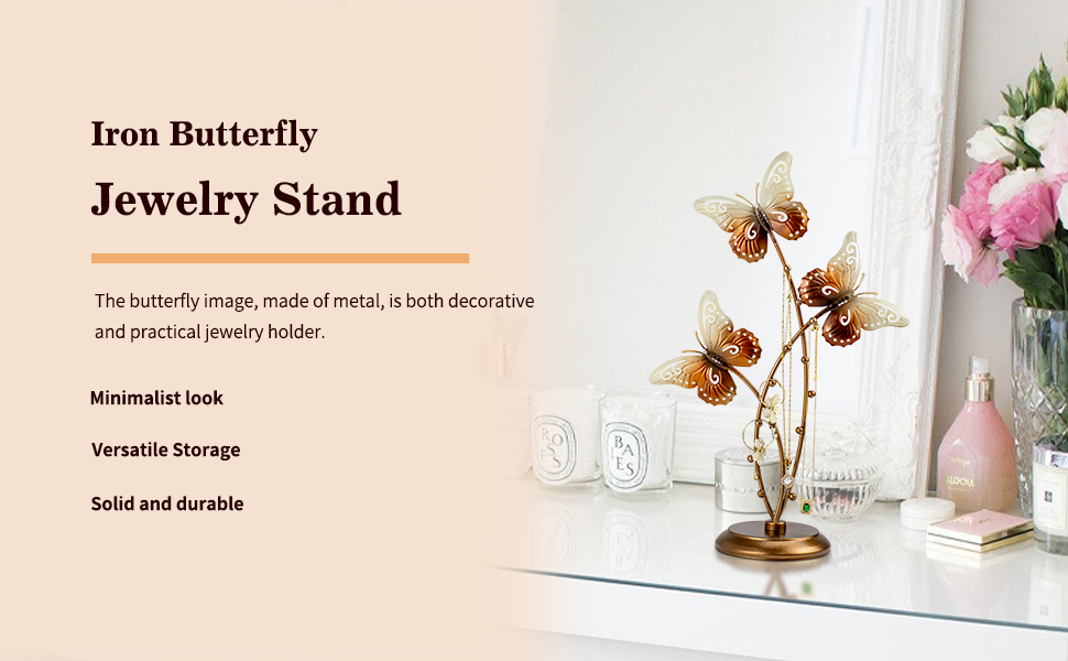 تصميم فراشة أنيق: تم تزيين حامل المجوهرات الخاص بنا بثلاث فراشات ذهبية رقيقة، مما يخلق نقطة محورية ساحرة مع توفير مساحة واسعة لتنظيم الأقراط والقلائد والأساور والخواتم، مما يحافظ على مجموعتك خالية من التشابك ومرئية.