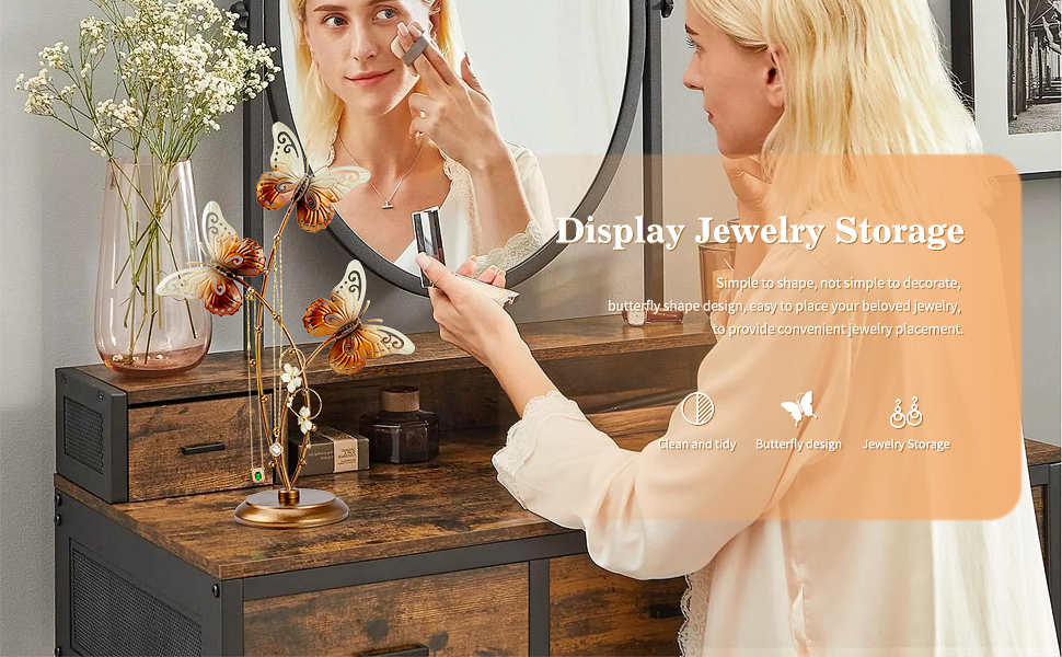 شاشة موفرة للمساحة وديكور عملي: مع ارتفاع إجمالي يبلغ 16 بوصة وبصمة قدم صغيرة، فهي مثالية لأي طاولة تزيين أو خزانة ملابس أو حمام. إنه يحول تخزين المجوهرات إلى جزء أنيق من ديكور منزلك، مما يضيف لمسة من الفخامة إلى مساحتك.