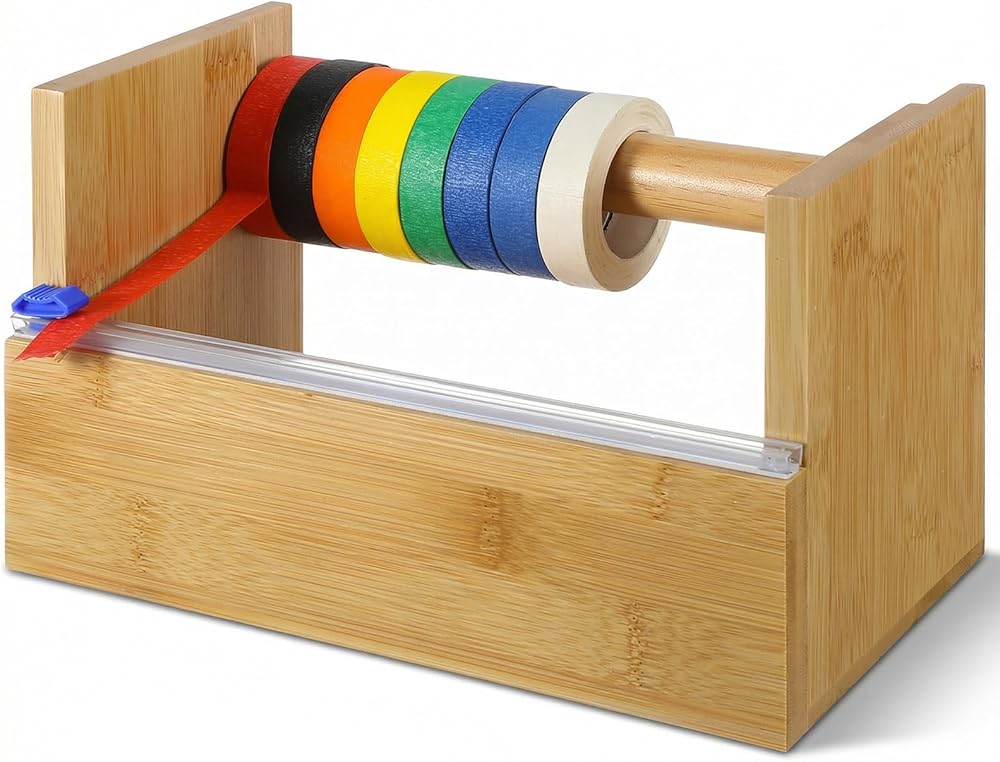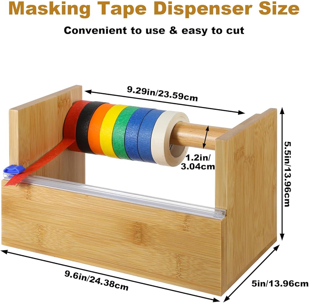 موزع أشرطة خشبي متعدد اللفات مع قطاعة أكريليك، وموزع وحامل شريط لاصق خشبي، وحامل أشرطة حرفية مقاس 9.4 بوصة وقاعدة منظمة للأطفال في المنزل والمكتب والمدرسة، مع 16 قطعة من الأشرطة اللاصقة
