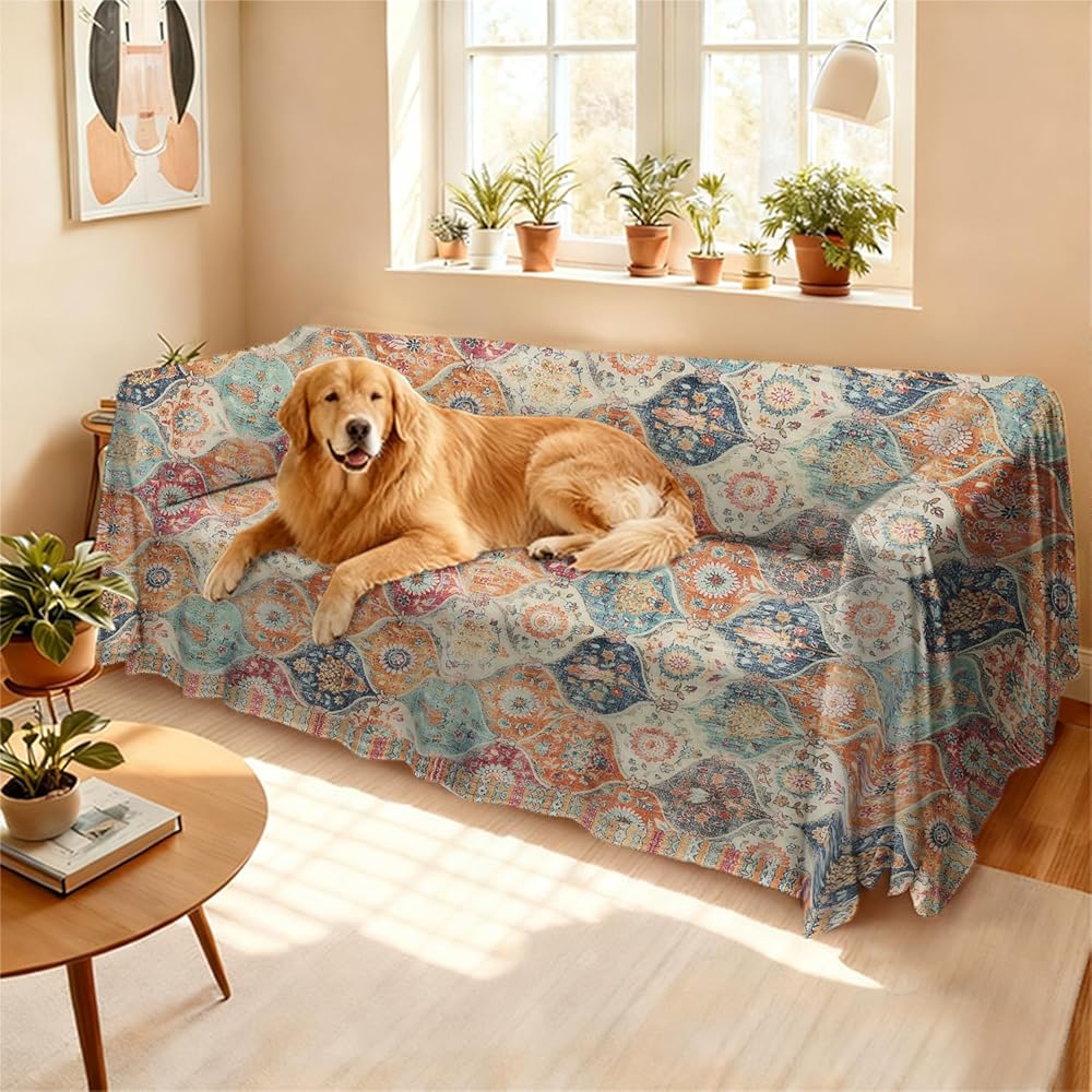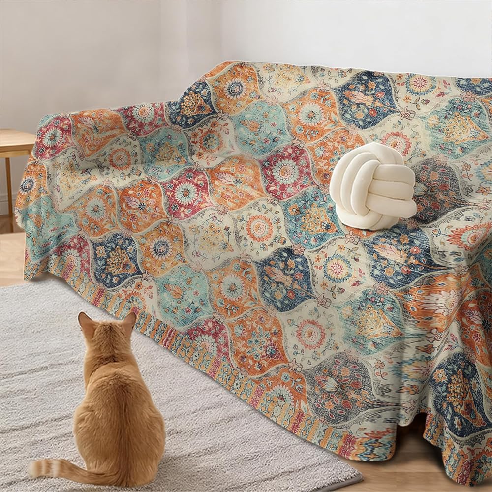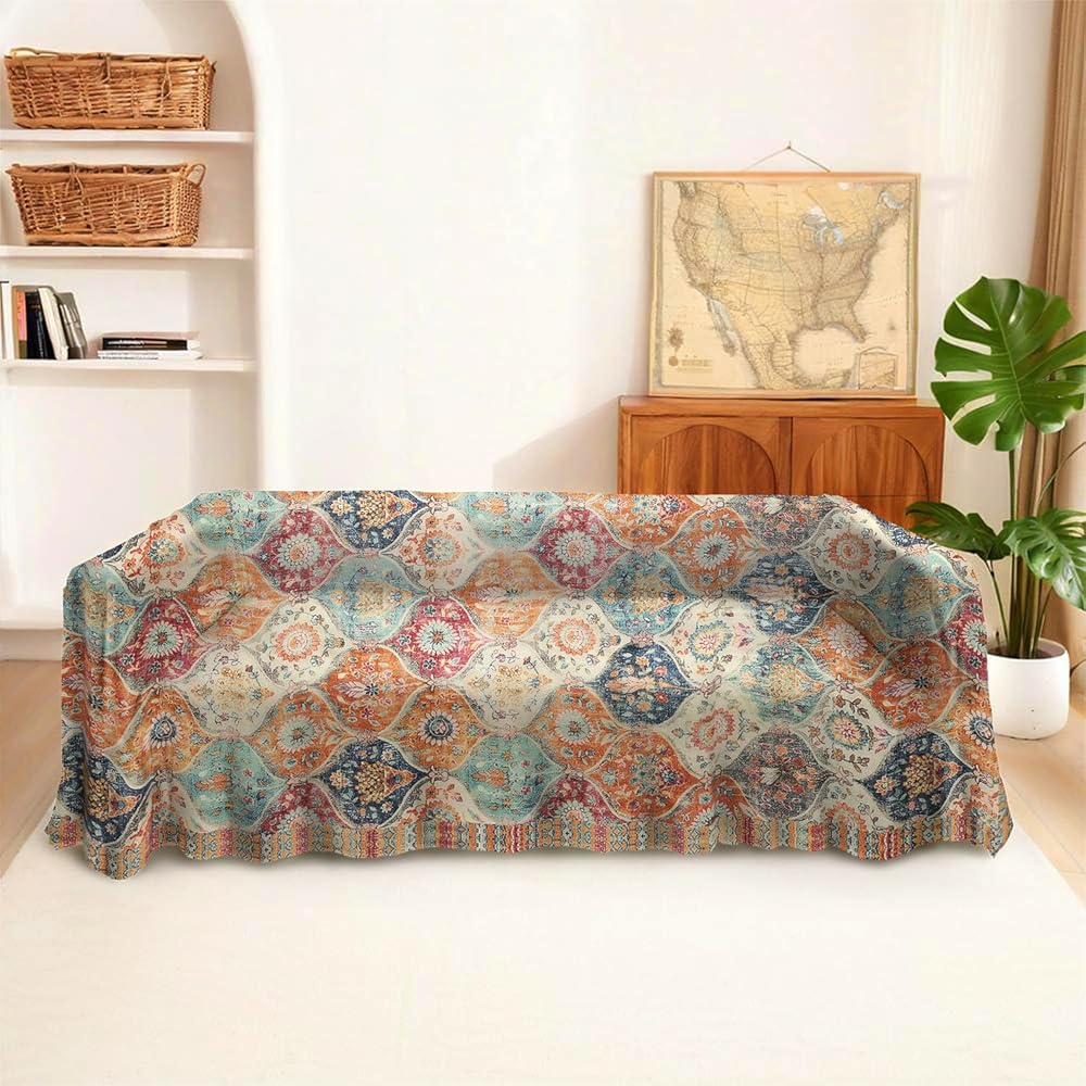 يمكن أن يكون غطاء الأريكة البوهيمي هذا مفرش سرير، أو سجادة، أو مفرش طاولة، أو نسيج معلق على الحائط، أو بطانية مكتب، أو ملاءات سرير.