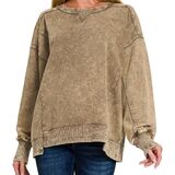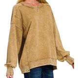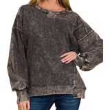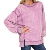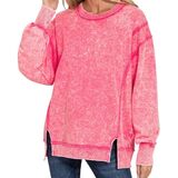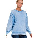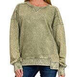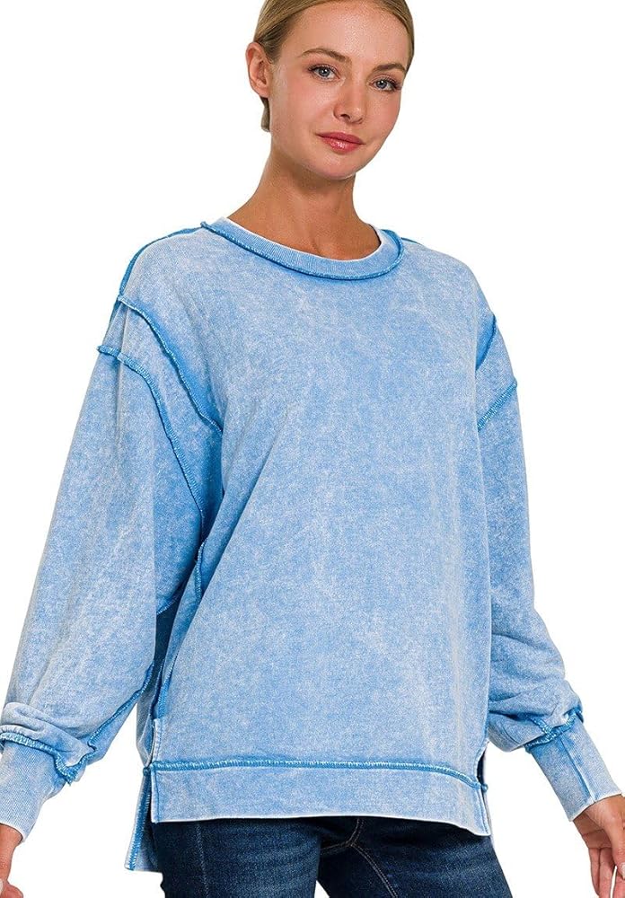 Women Long Sleeve Acid Wash French Terry Exposed Seam PullOver Sweater Sweatshirt Blouse Top.