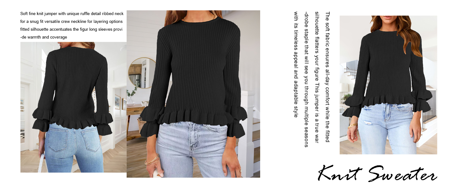 • سترة ناعمة متماسكة مع تفاصيل مكشكشة فريدة من نوعها، رقبة مضلعة لملاءمة مريحة، خط عنق دائري متعدد الاستخدامات لخيارات الطبقات، صورة ظلية مناسبة تبرز الشكل، أكمام طويلة توفر الدفء والتغطية.