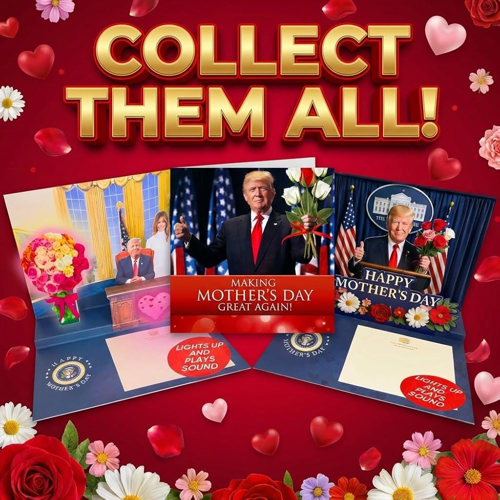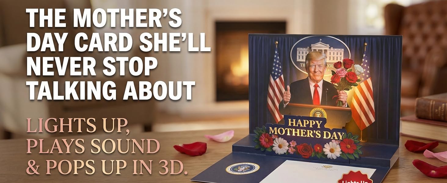 • تضيء بمشهد منبثق رئاسي - تتميز هذه البطاقة الناطقة بترامب على المنصة مع الورود والأعلام ولافتة "عيد الأم السعيد" التي تتوهج عند فتحها، ولا حاجة إلى أزرار