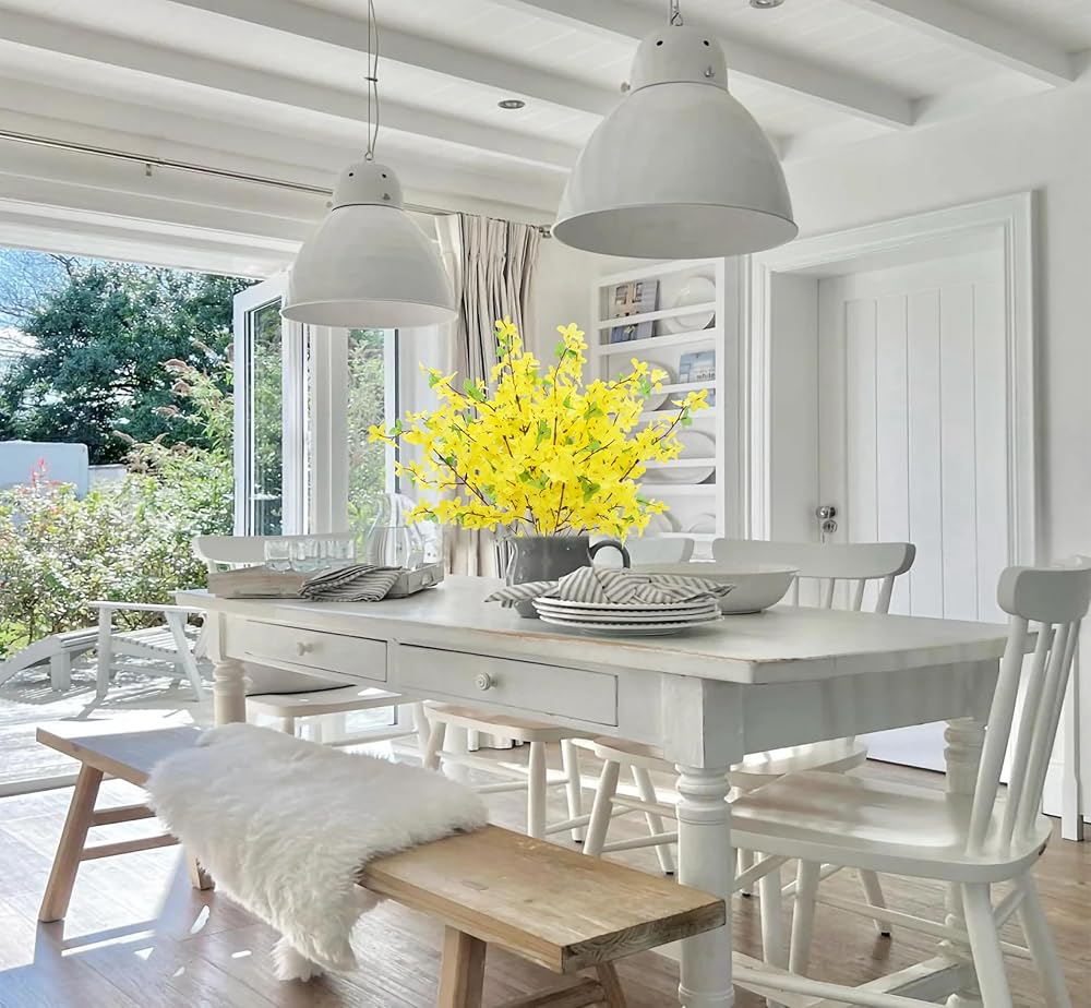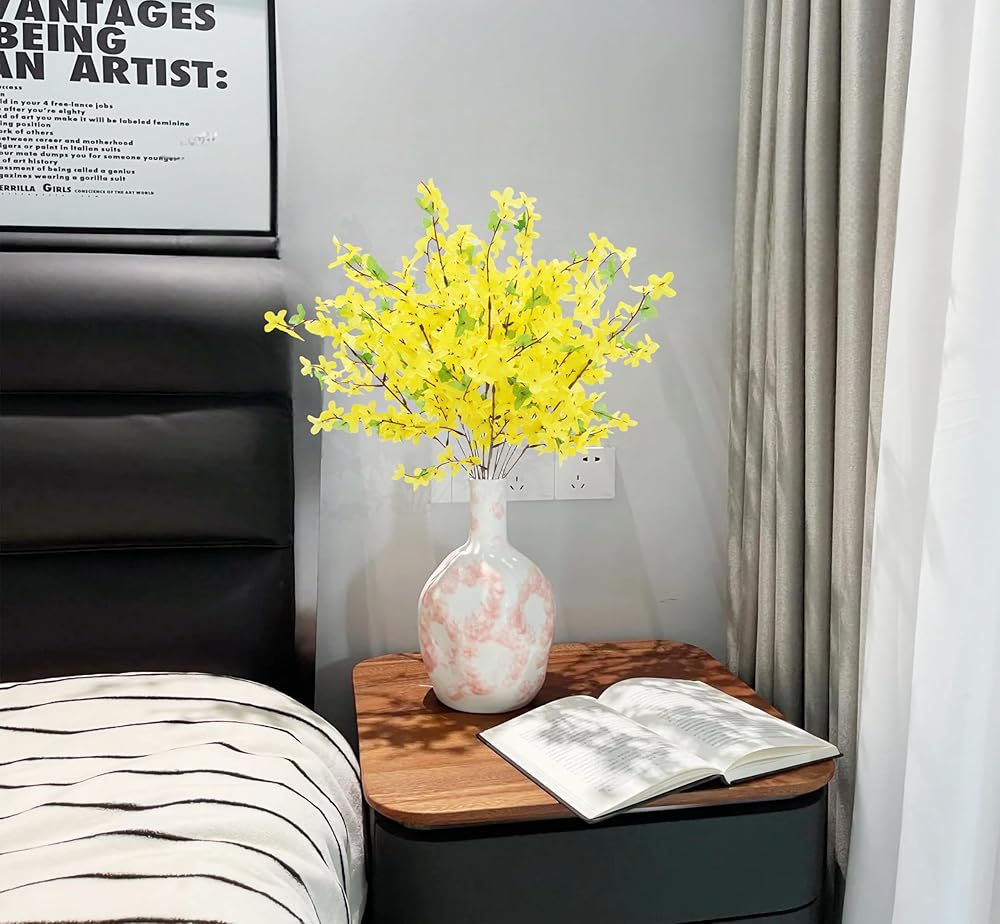 Fake forsythia flowers look beautiful all year round faux flowers branches are suitable for decorating wedding party, stages, living room, bedroom, office, dining room, birthdays and others. The leaves never wither and fall, look vivid and lifelike.