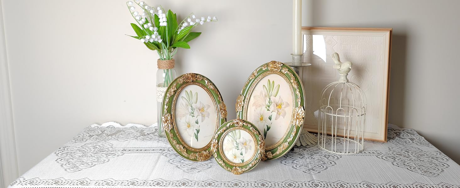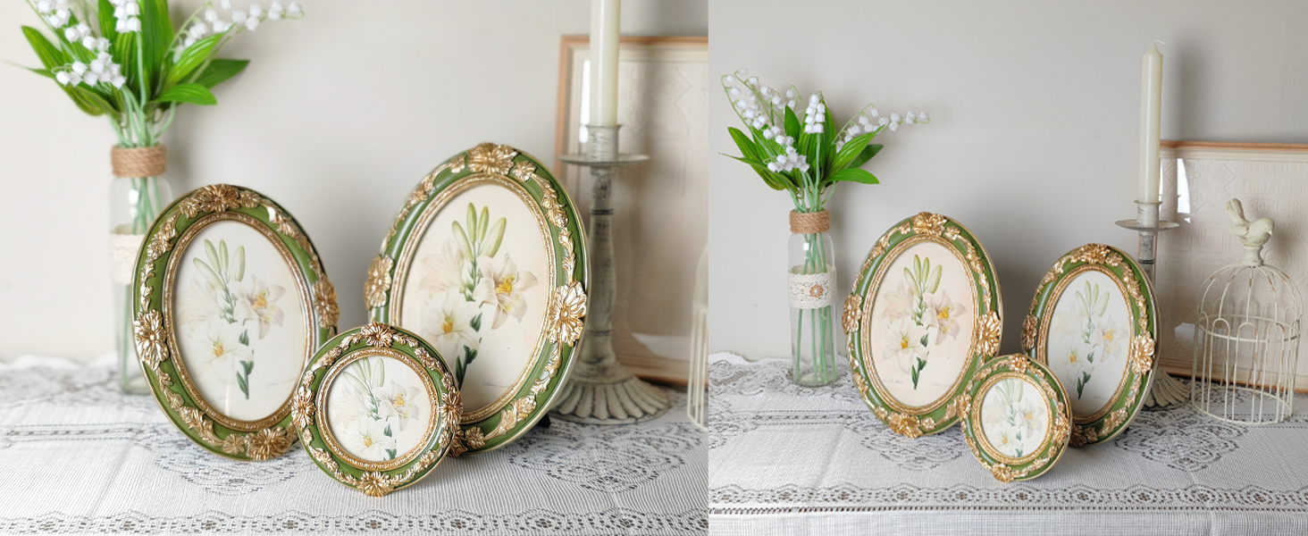 جودة ممتازة وحرفية حرفية: كل إطار صورة عتيق مصنوع من الراتنج المتين ومطلي باللونين الأخضر والذهبي مع مظهر عتيق من خلال الرسم اليدوي متعدد الطبقات. تحمي الواجهة الزجاجية عالية الدقة ذكرياتك من الغبار والخدوش، بينما يضيف الجزء الخلفي المخملي الأسود الفاخر مزيدًا من الحماية والرقي.