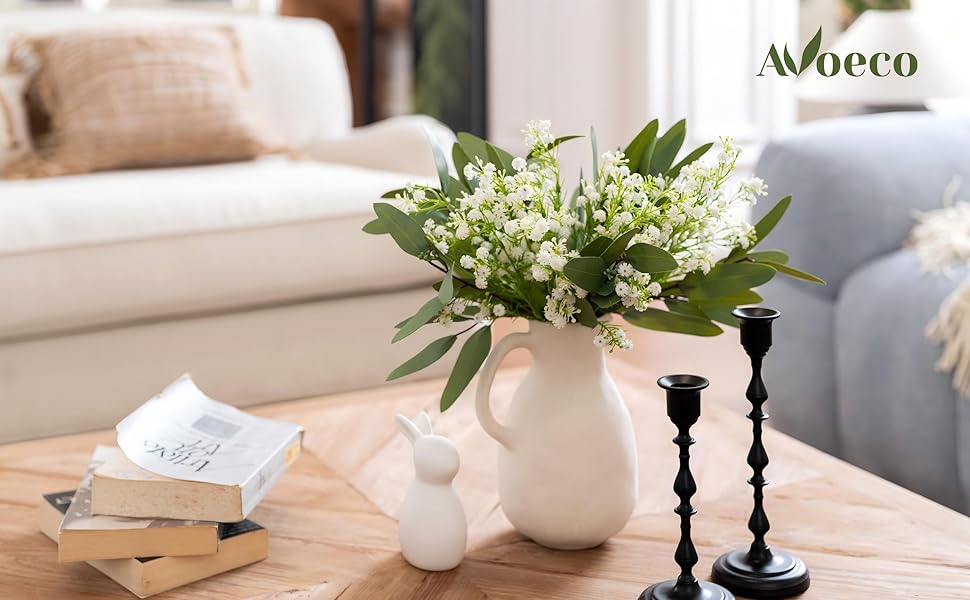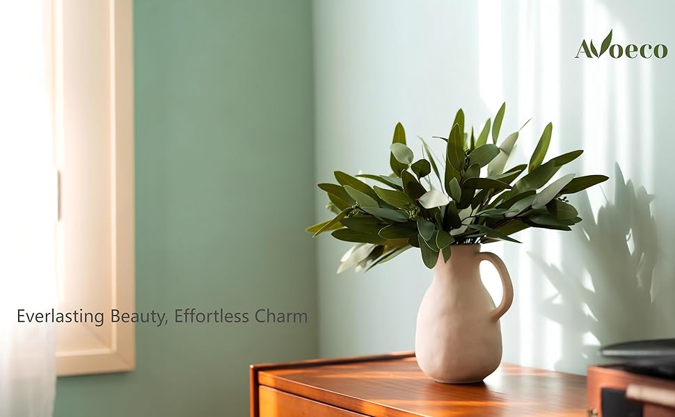 مجموعة الأحجار الكريمة: مع الخشب والقماش: إجمالي 15 لونًا – 9 أحجار أوكالبتوس بسيطة و6 مع أخشاب الصنوبر، بطول 37 سم – لمزيد من الهيكل ومظهر طبيعي كامل. (مزهرية غير مملوءة.)