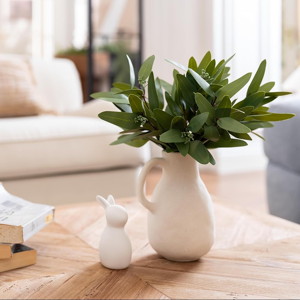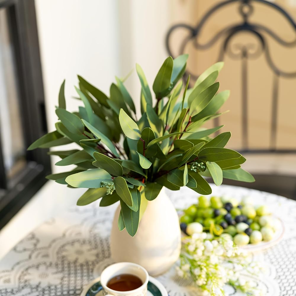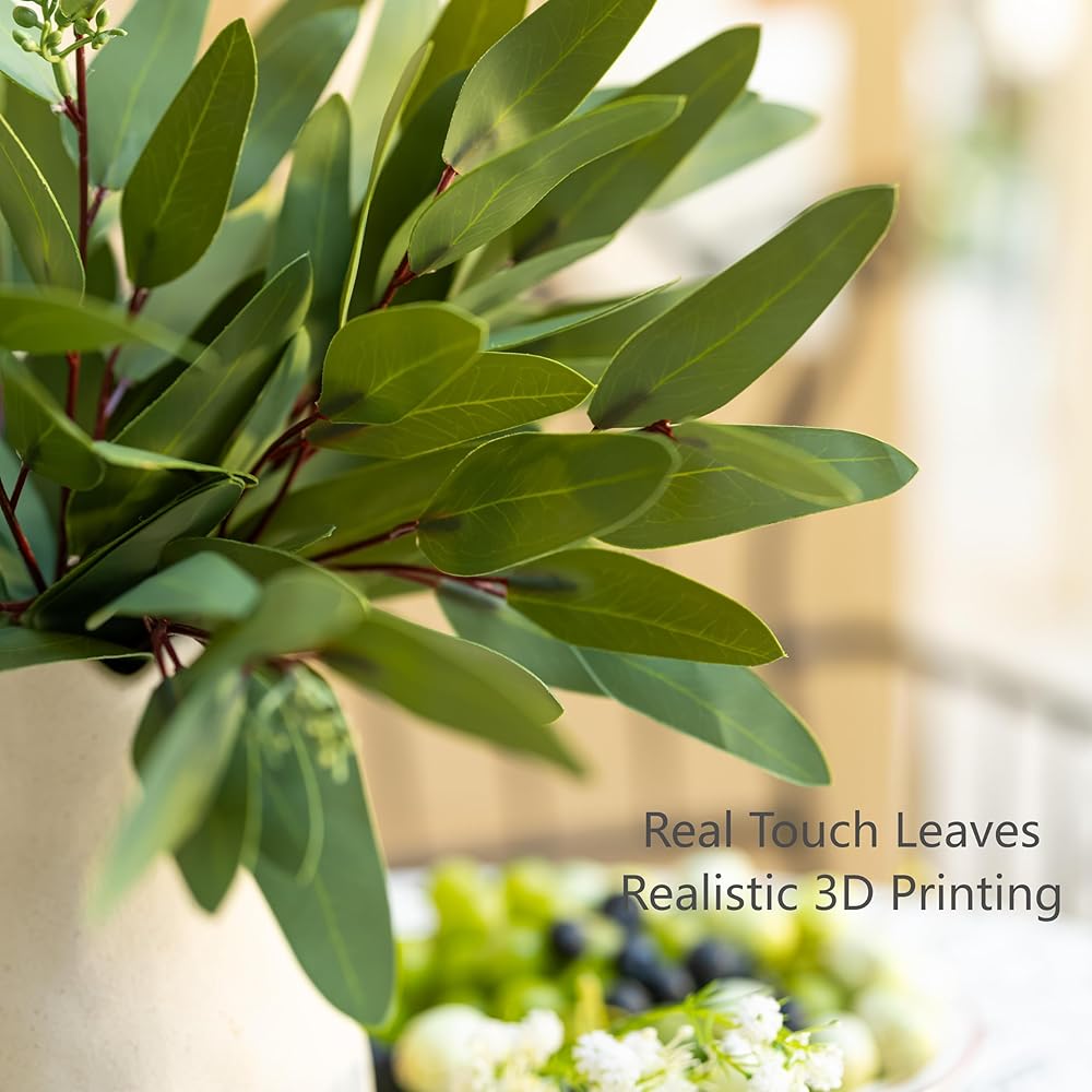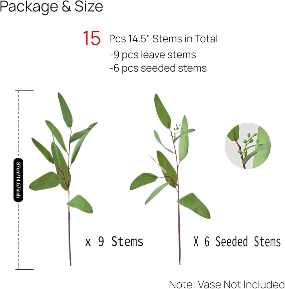 15 قطعة من سيقان الأوكالبتوس الصناعية - خضرة صناعية ذات ملمس حقيقي مع فروع البذور والأوراق، شجرة زيتية بطول 14.5 بوصة للمزهرية، ترتيبات الزهور DIY، باقات الزفاف، ديكور المنزل، القطع المركزية
