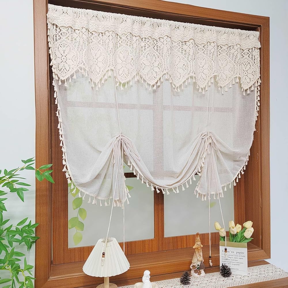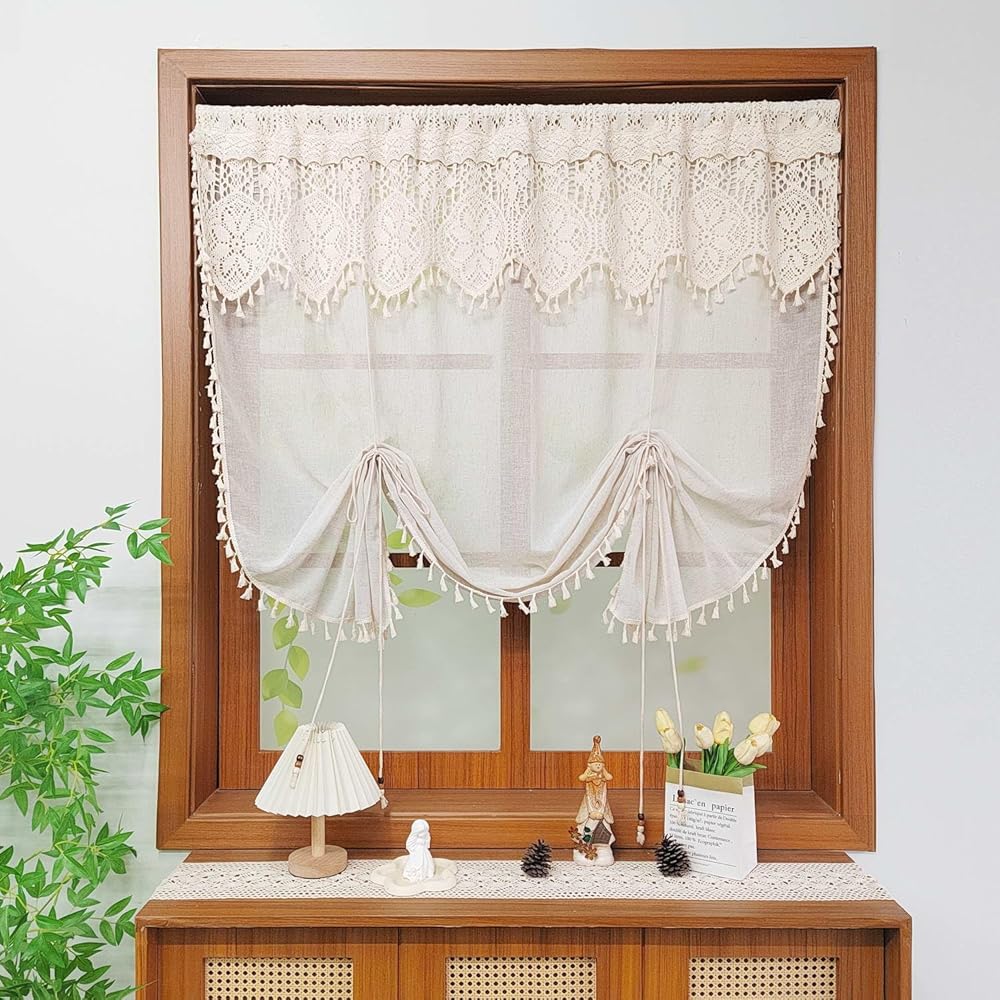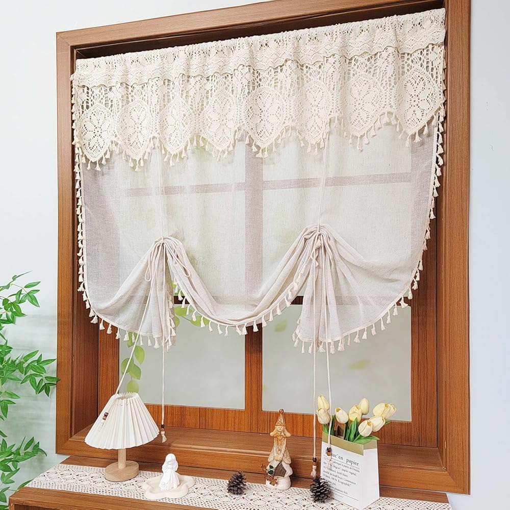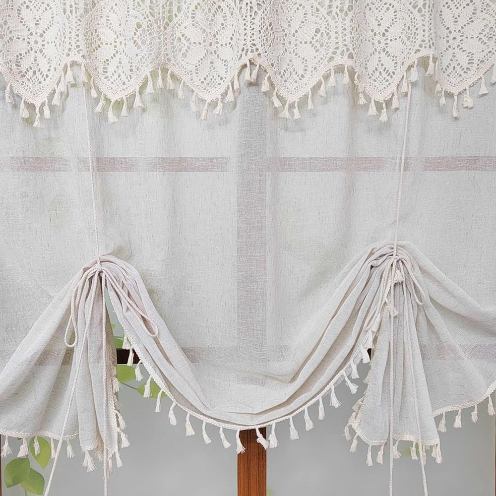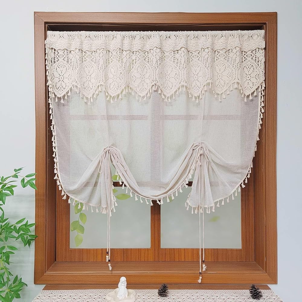 Elegant 2 layered beige crochet lace floral sheer adjustable tie up curtain valance, suitable for kitchen, dining room, cafe room small window, baby nursery room window, blacony window