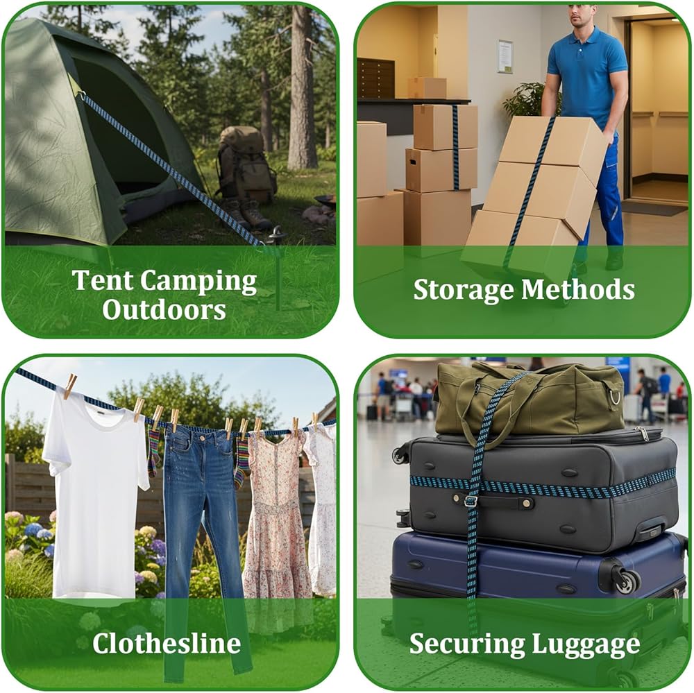 • Versatile Application Range: Suitable for multiple securing needs including luggage, cargo, outdoor equipment, and household items. These cords effectively fasten suitcases, secure roof racks, stabilize tents and tarps, organize tools, and provide reliable solutions for moving, camping, travel, and storage scenarios in various environments.