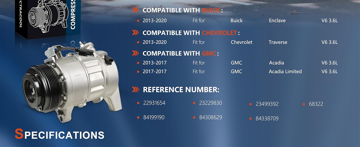 [توافق السيارة]: متوافق مع شيفروليه ترافيرس 2013-2020؛ متوافق مع جي إم سي أكاديا 2013-2017، أكاديا المحدودة 2017؛ متوافق مع Buick Enclave V6 3.6L 2013-2020. يرجى التحقق من ملاءمة السيارة لضمان حصولك على المنتج الصحيح لسيارتك.