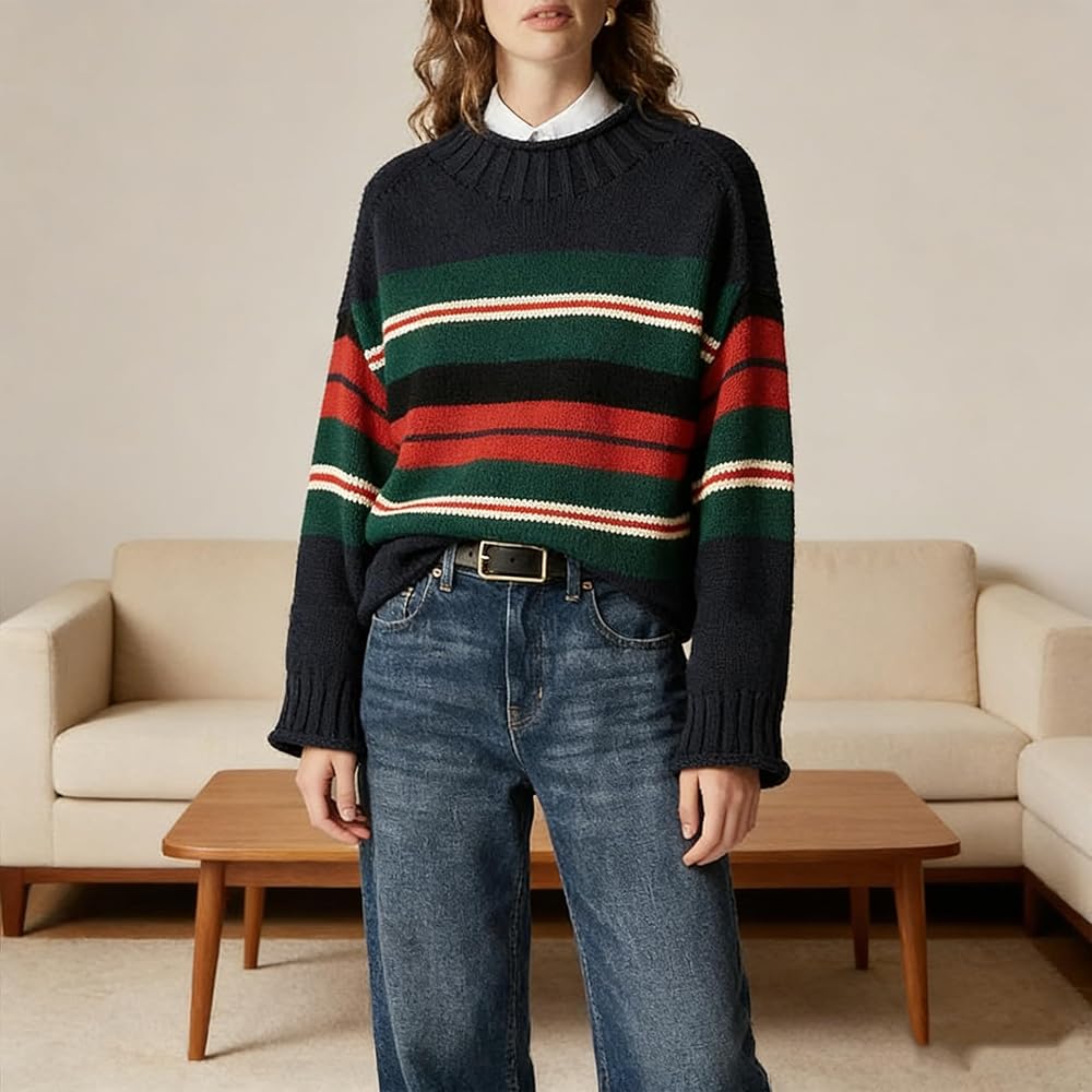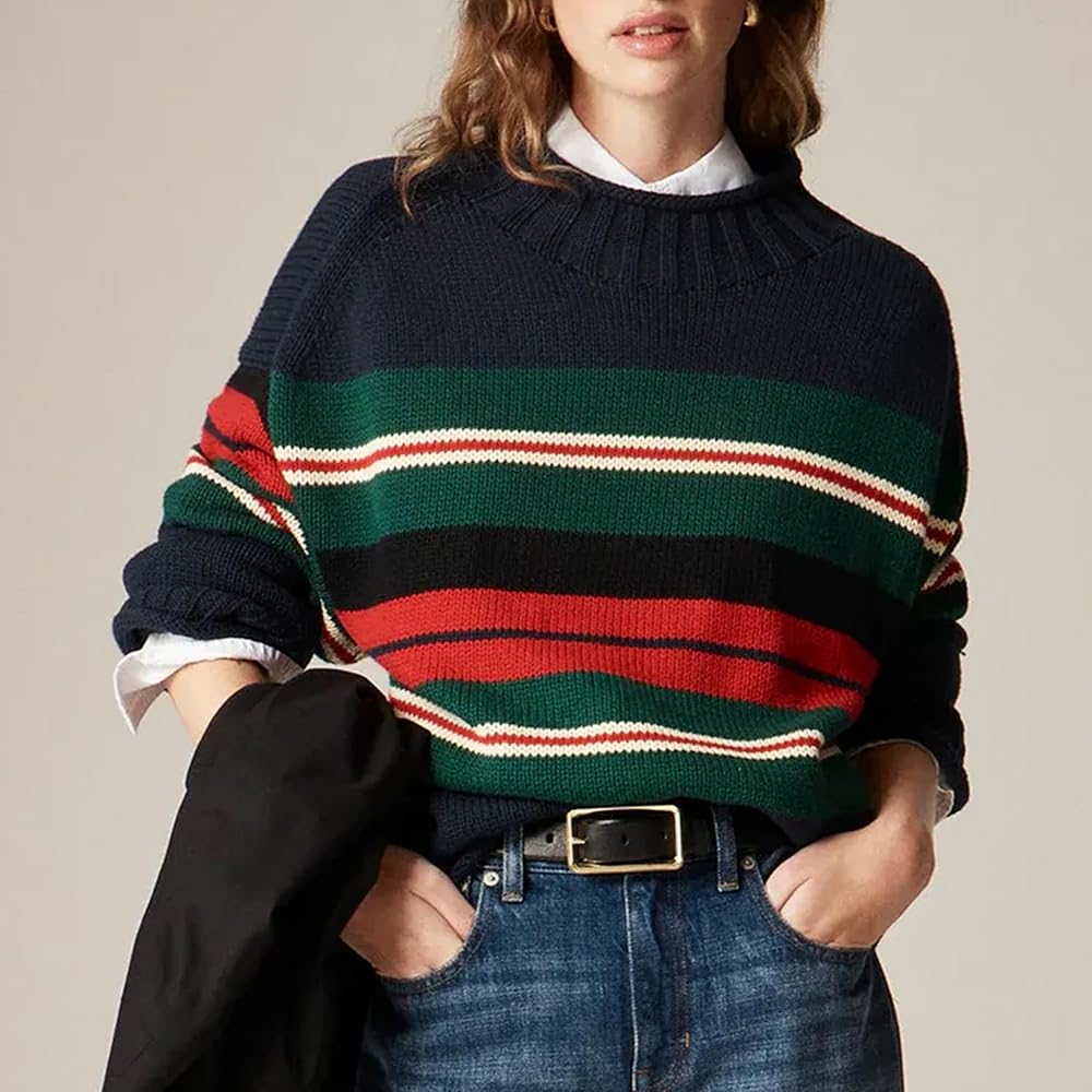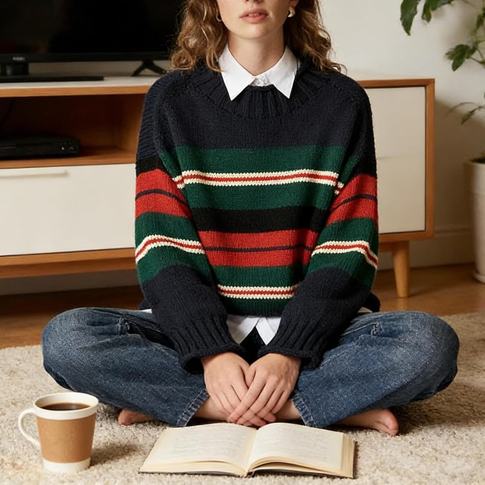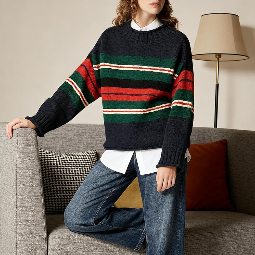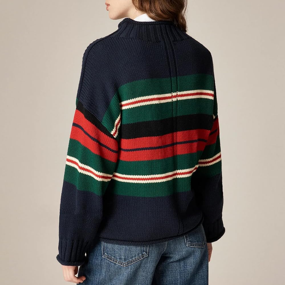 سترات كبيرة الحجم للنساء ذات رقبة عالية وأكمام طويلة وناعمة ومكتنزة ومتماسكة بلوفر مخطط ملابس خارجية (مخطط كحلي، M)