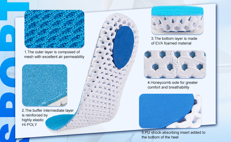 راحة ناعمة وقابلة للتنفس: يعتمد هذا المنتج على تصميم ثلاثي الطبقات. 1. تتكون الطبقة الخارجية من شبكة ذات نفاذية هواء ممتازة. 2. الطبقة المتوسطة العازلة معززة بمادة HI-POLY المرنة للغاية، والتي لها تأثير ممتاز في امتصاص الصدمات. 3. الطبقة السفلية مصنوعة من مادة EVA الرغوية