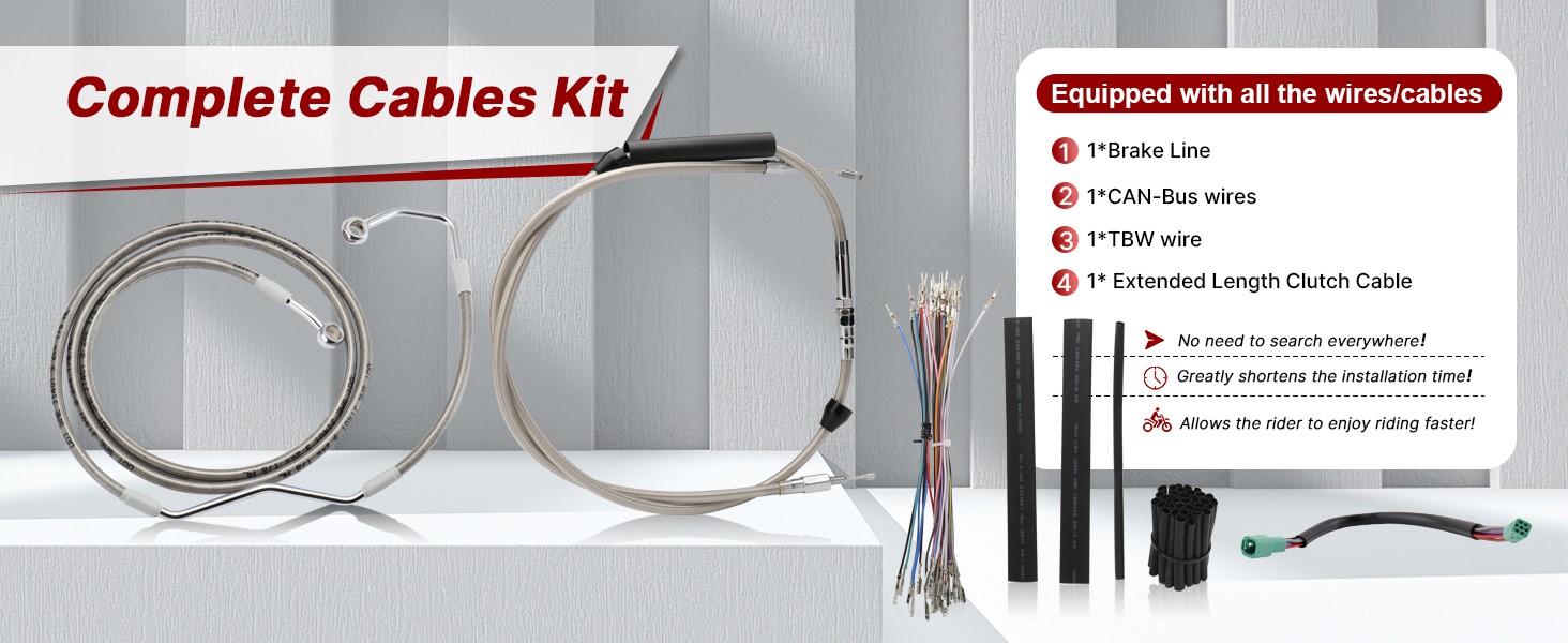 جودة الكابلات: مجموعة الكابلات السياحية الممتدة المصنوعة من الفولاذ المقاوم للصدأ، وأسلاك CAN-Bus، وذبابة الخانق الإلكترونية بواسطة سلك المقود السلكي (سلك TBW)، وكابل القابض ذو الطول الممتد مع طلاء الفينيل الأسود تخلق هذا المظهر المميز دون أي ضرر للمناطق التي يلامس فيها الكابل. تضمن جميع الأسلاك الداخلية المتينة أيضًا أن يتمتع الكابل بأكمله بعمر أطول وأداء أفضل عند الاستخدام.