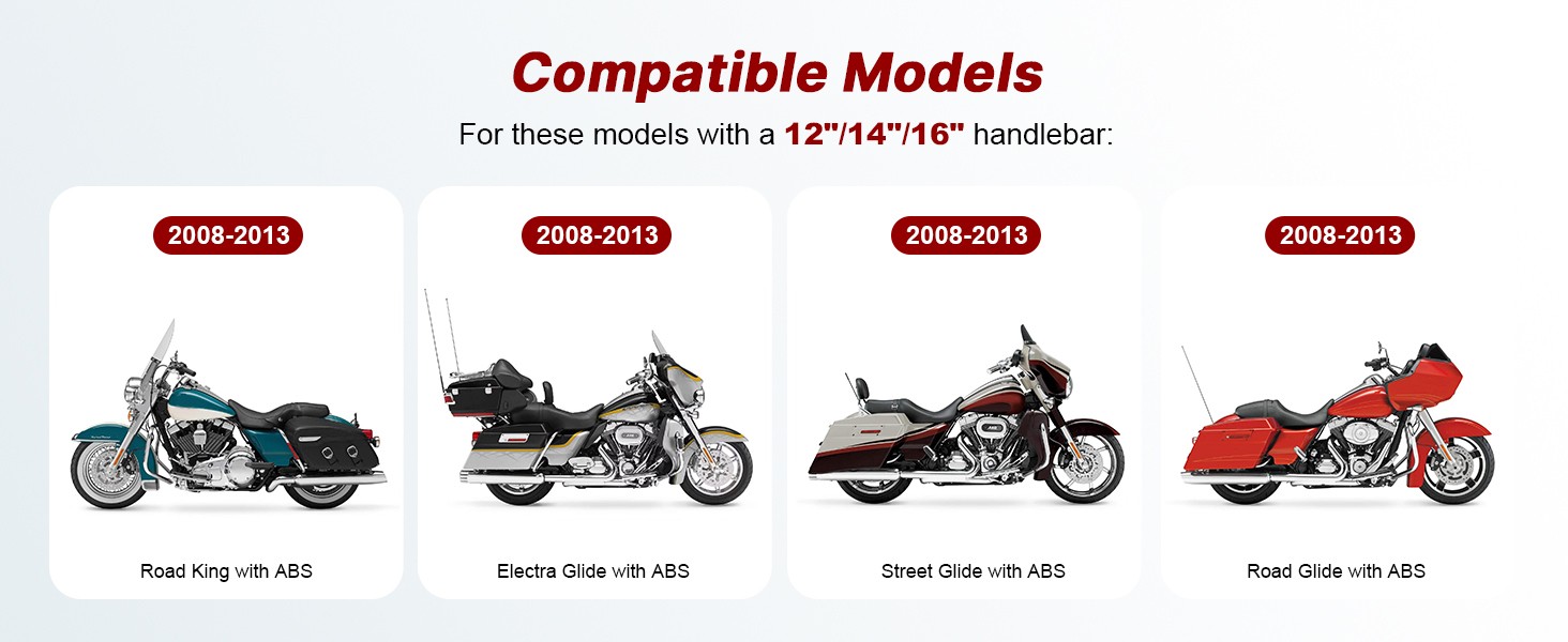الإعداد: مجموعة كابلات الرحلات الموسعة هذه مخصصة لموديلات Harley Touring 2008-2013 مع ABS (Road King، Electra Glide، Street Glide، Road Glide) ملاحظة: هذا المنتج مناسب للنماذج التي تحتوي على ABS. يرجى التحقق بعناية من سنة دراجتك وطرازها وما إذا كانت تحتوي على ABS، حيث قام بعض العملاء بشراء المنتج الخطأ بسبب هذه المشكلة.