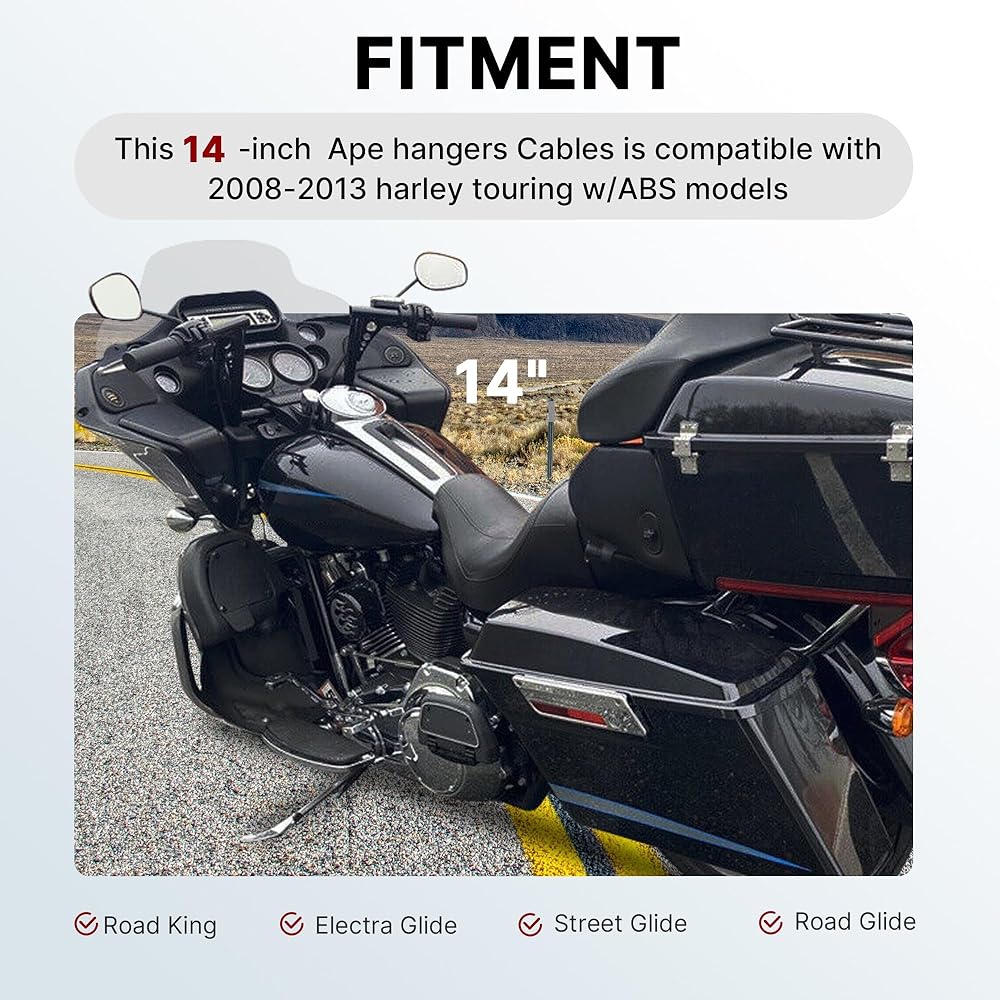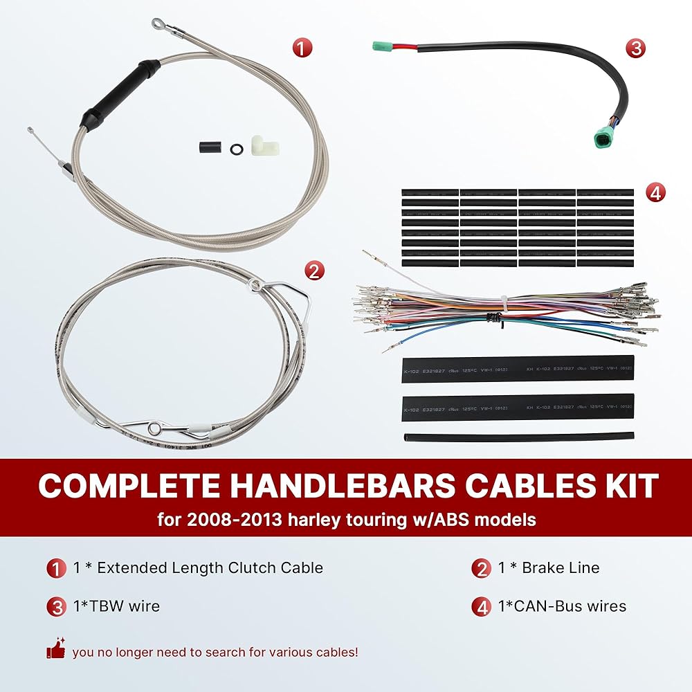 كابلات ممتدة: تتميز مجموعة الكابلات الممتدة Touring مع نماذج ABS بكابلات أطول من أسلاك/كابلات OEM لاستيعاب المقاود أو الناهضات الأطول. (يرجى التحقق من نماذج الدراجات النارية المحددة في صفحة الوصف قبل الشراء، شكرًا لك.)