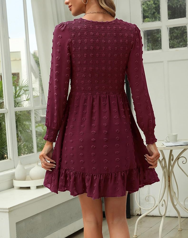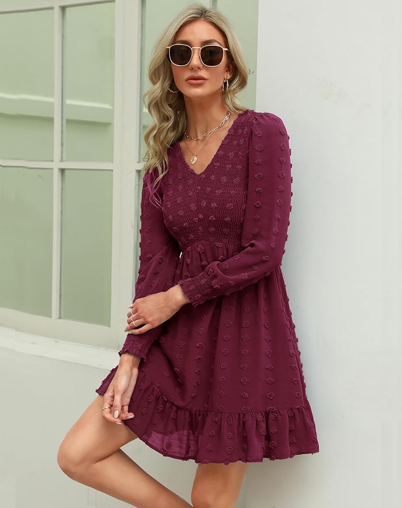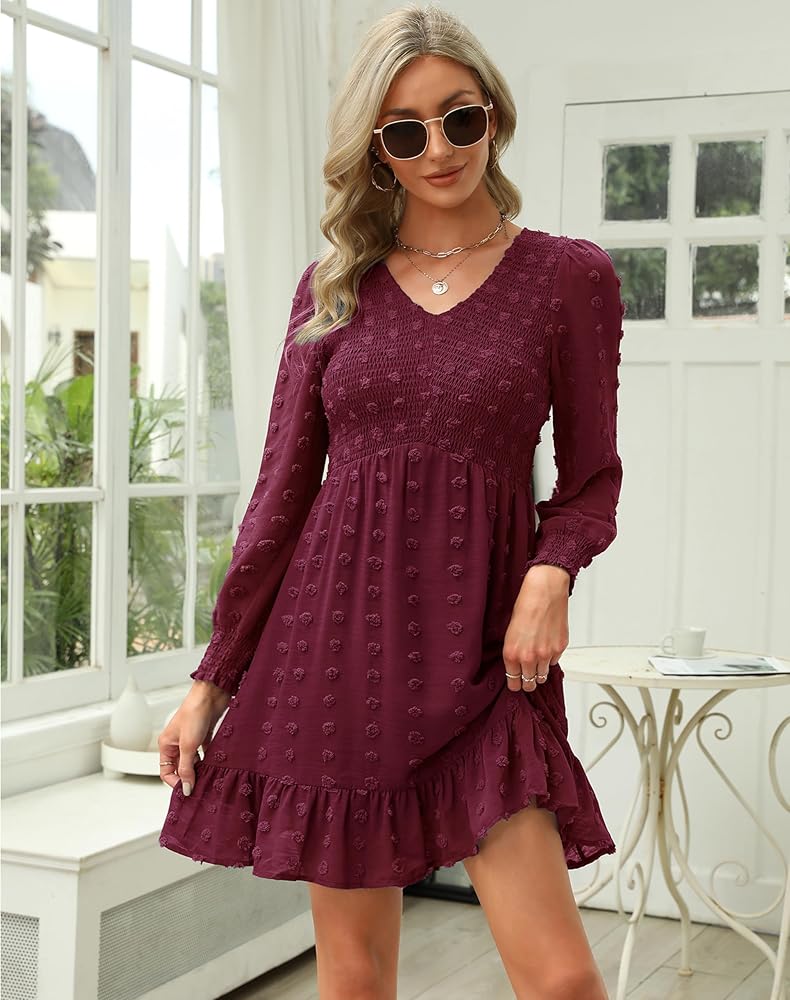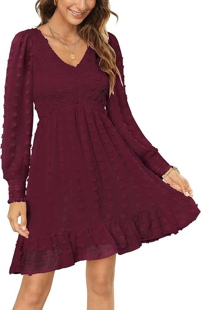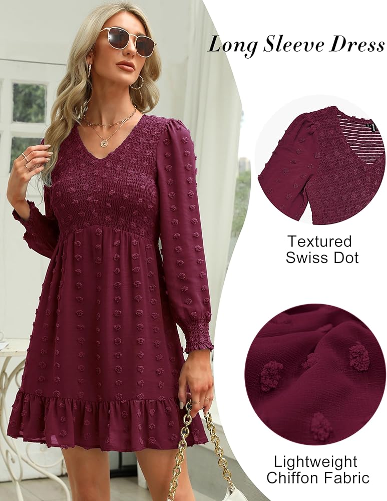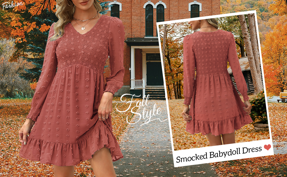 فستان بيبي دول للنساء: نحن نحب هذا الفستان الكاجوال طويل الأكمام مع خصر عالي متعرج وأكمام شفافة فضفاضة! يسمح الصدر المدخن بمساحة أكبر في الصدر، وطول الركبة أعلاه يجعل ساقيك تبدو أطول، فستان حمل مثالي لضيوف الزفاف، فستان شتوي لا غنى عنه