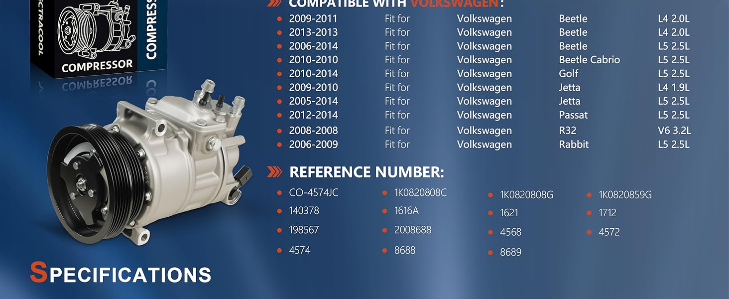 ضاغط تكييف الهواء CO-4574JC متوافق مع Audi TT RS Quattro 2012-2013 2.5L؛ متوافق مع فولكس فاجن جيتا 2009-2010 1.9L، 2005-2010، 2011-2014 2.5L استبدال #198567