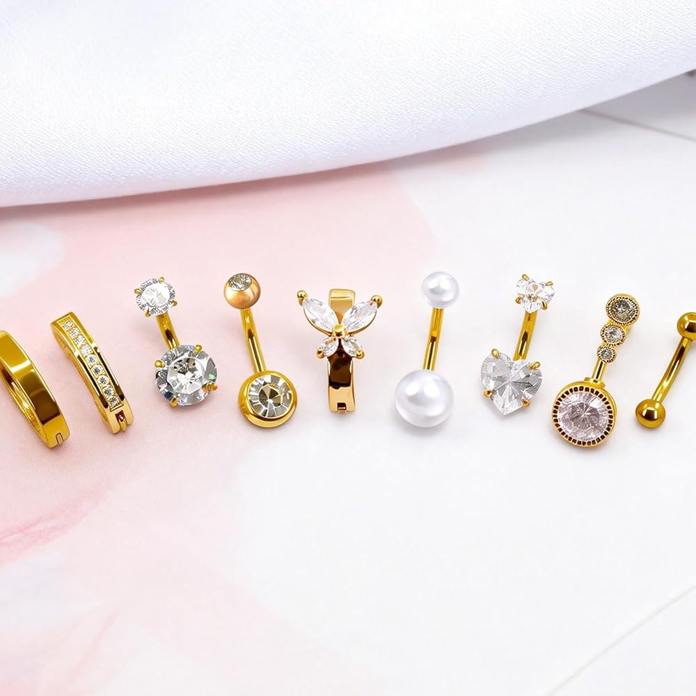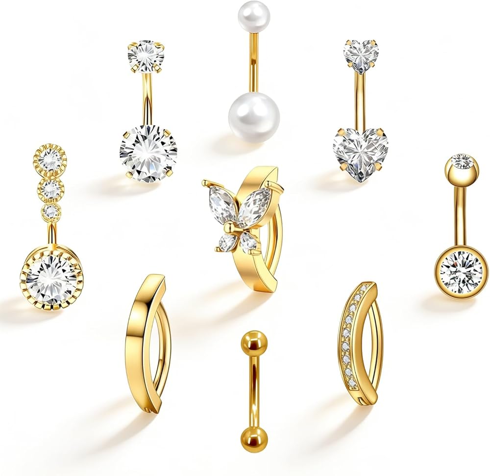 【9-Piece Belly Button Ring Set】 One order includes 9pcs gold belly button piercing: 3pcs clicker hoop belly button ring, 1pcs pearl belly button ring; 4pcs shiny cz, 1pcs simple ball belly ring, heart and butterfly belly button rings pack, multiple classic style to decorate your navel.