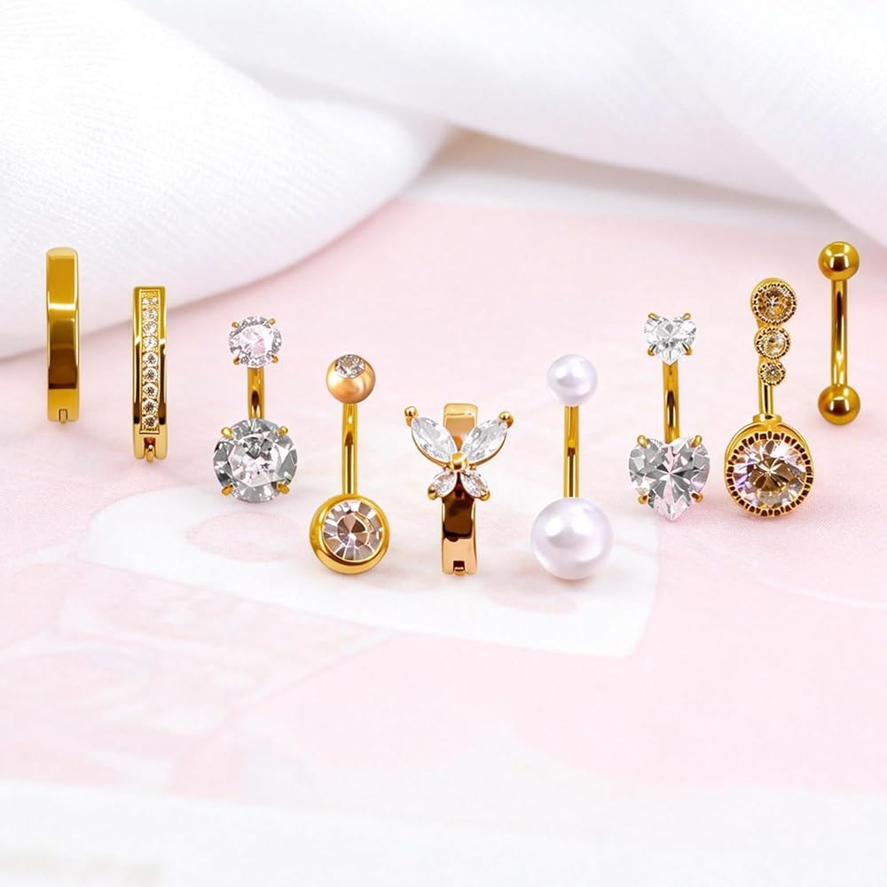 خاتم زر البطن الذهبي - مجموعة مجوهرات السرة الفولاذية الجراحية المضادة للحساسية 14 جرام، 9 قطع حلقات بطن أنيقة للنساء مع لؤلؤ فراشة على شكل قلب، متدلية متلألئة تشيكوسلوفاكيا، حلقة زر البطن