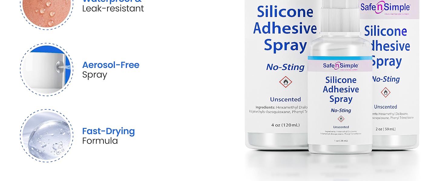 • رذاذ لاصق متعدد الاستخدامات للأجهزة الطبية - بالإضافة إلى العناية بالفغرة، يمكن استخدام هذا الرذاذ اللاصق الطبي للمساعدة في تأمين أشكال الثدي والأطراف الاصطناعية وقسطرة الواقي الذكري وأجهزة الاستشعار الطبية القابلة للارتداء والأجهزة الخارجية المماثلة التي تتطلب التصاقًا موثوقًا بالجلد.