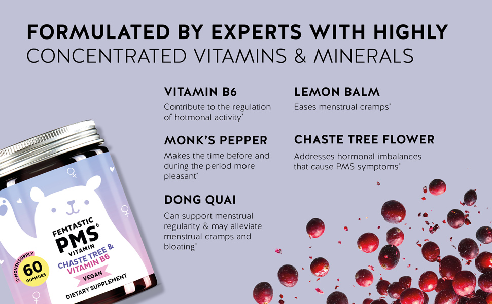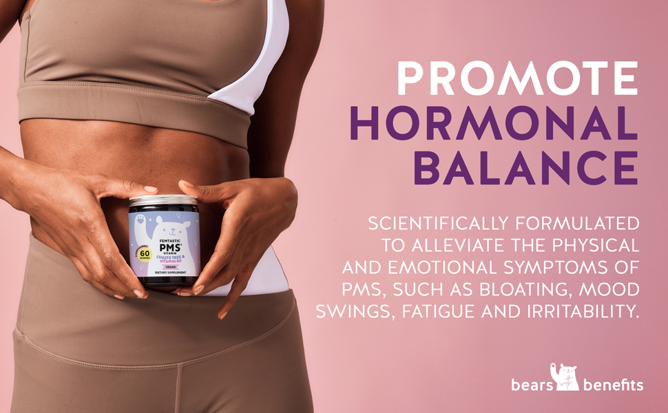 التوازن الهرموني وتخفيف أعراض الدورة الشهرية: تقليل الانتفاخ والبثور وتخفيف التشنجات وتقلب المزاج بفضل تشاستيبيري وبلسم الليمون وفيتامين ب6. قد يدعم Chasteberry أيضًا مستقبلات الشعور بالسعادة في الجسم، مما يساعد في تخفيف آلام الدورة الشهرية.