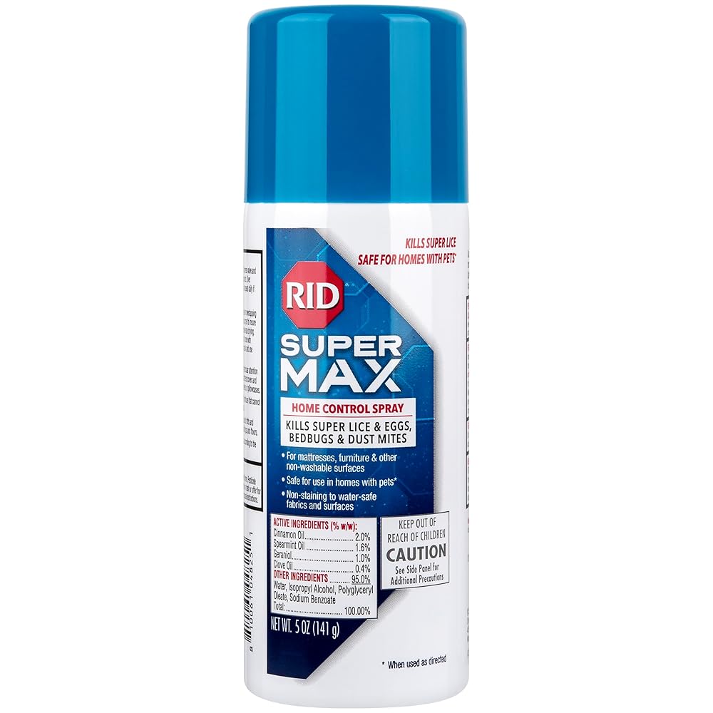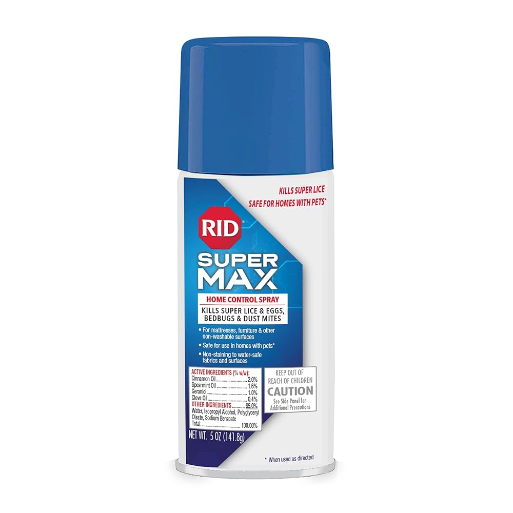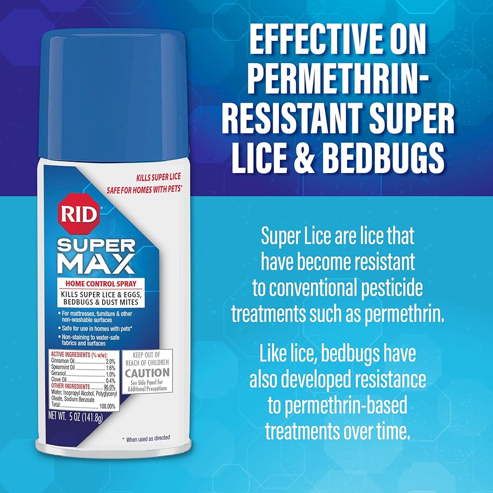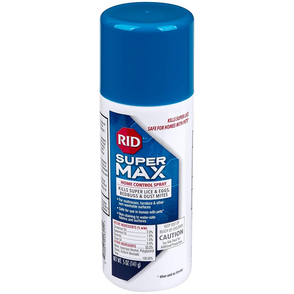 RID Super Max Home Control Spray is 10X more effective at killing lice than the traditional pesticide-based sprays. An advanced lice, bedbug, and dust mite killing spray that has been shown in lab testing to kill 100% of lice and bedbugs. That's because it is effective on super lice and bedbugs that are resistant to traditional pesticide ingredients like permethrin. Use it on non-washable surfaces such as furniture, rugs, mattresses, or car interiors. Safe to use in homes with pets. Non-staining on water-safe fabrics.