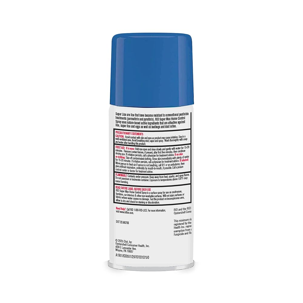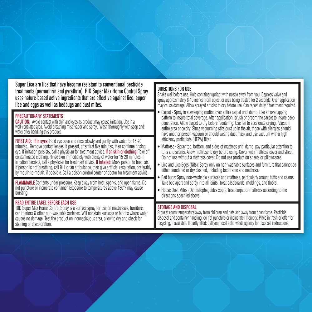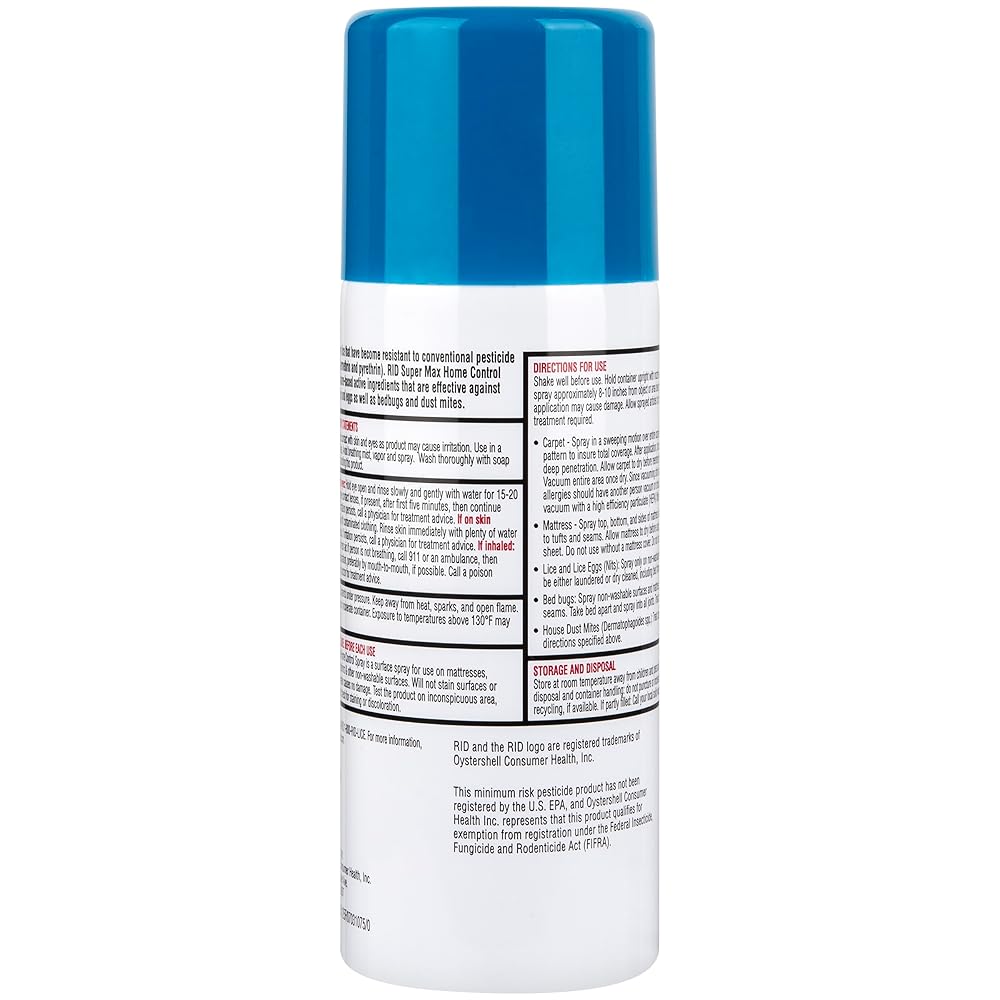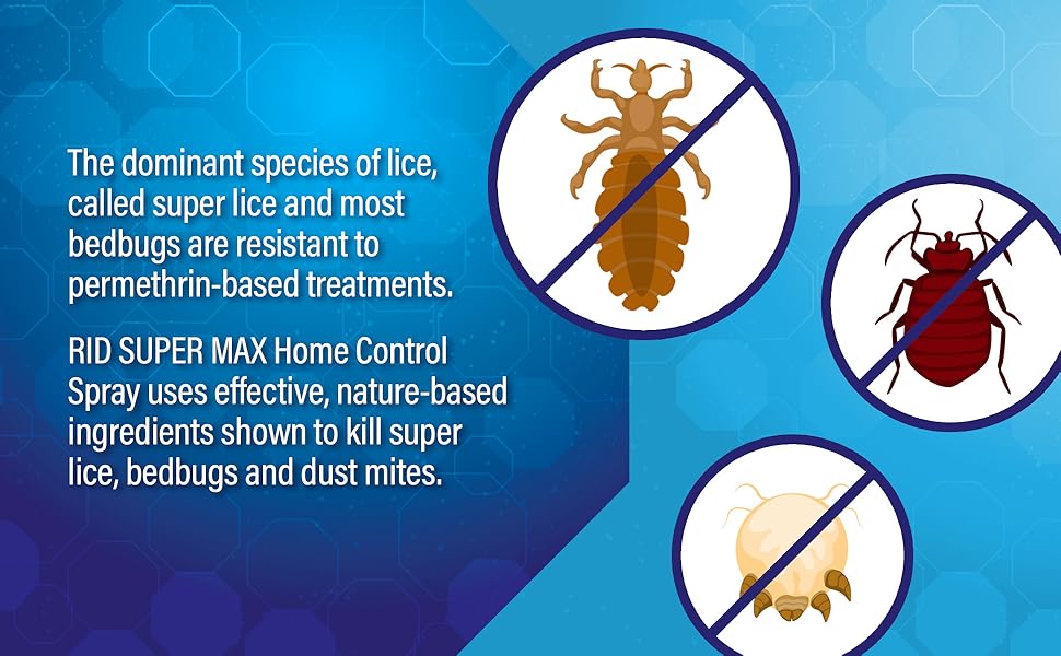 RID Super Max Home Control Spray is 10X more effective at killing lice than the traditional pesticide-based sprays. An advanced lice, bedbug, and dust mite killing spray that has been shown in lab testing to kill 100% of lice and bedbugs. That's because it is effective on super lice and bedbugs that are resistant to traditional pesticide ingredients like permethrin. Use it on non-washable surfaces such as furniture, rugs, mattresses, or car interiors. Safe to use in homes with pets. Non-staining on water-safe fabrics.