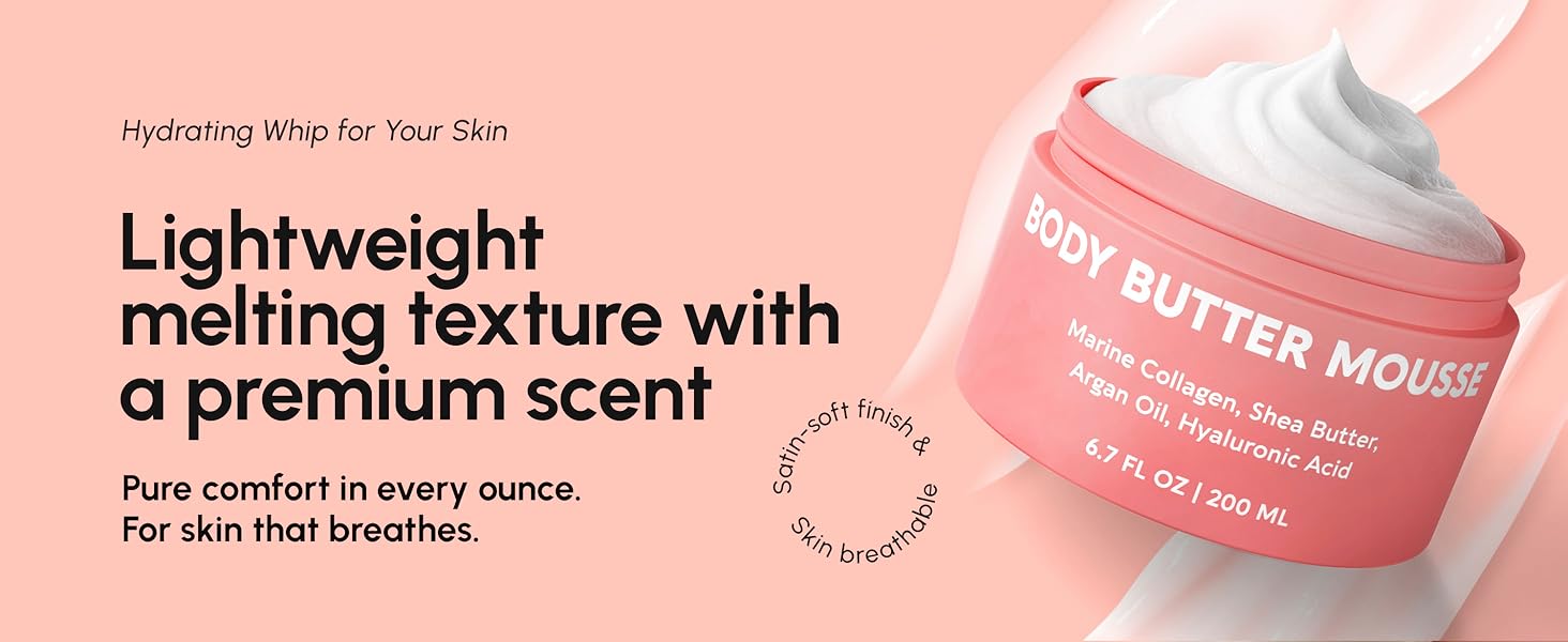 قوام زبدة الجسم المخفوق خفيف الوزن - يتميز موس زبدة الجسم هذا بقوام ناعم كالسحاب مصمم ليذوب بسرعة في الجلد. على عكس زبدة الجسم السميكة التقليدية، فهي خفيفة الوزن وغير قابلة للتمدد وسريعة الامتصاص، مما يوفر رطوبة مريحة.