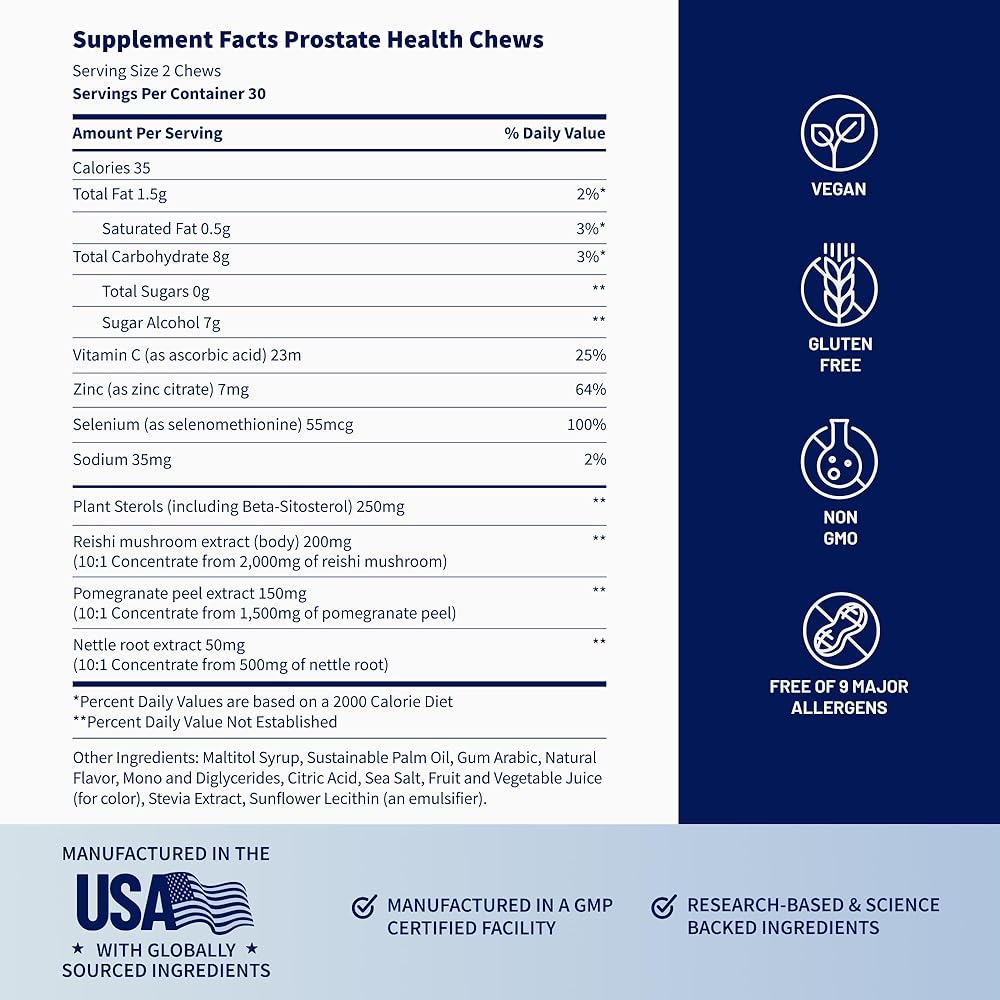 • Advanced Prostate Support Supplement With 10:1 Concentrated Extracts: Each chew delivers high-potency botanical extracts equivalent to 2,000mg Reishi mushroom, 1,500mg pomegranate peel, and 500mg stinging nettle root—plus 250mg plant sterols including beta-sitosterol to support healthy prostate function, normal hormone metabolism, and urinary wellness for men over 45.*
