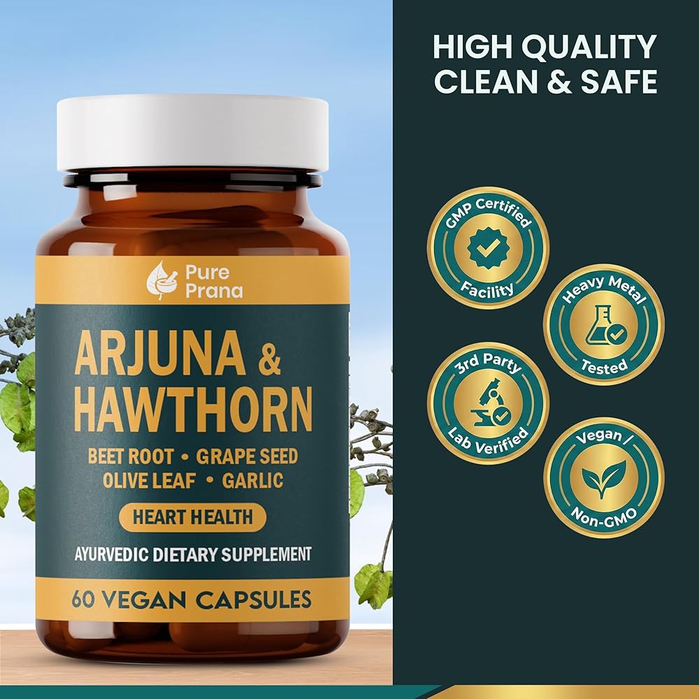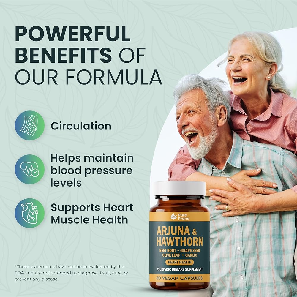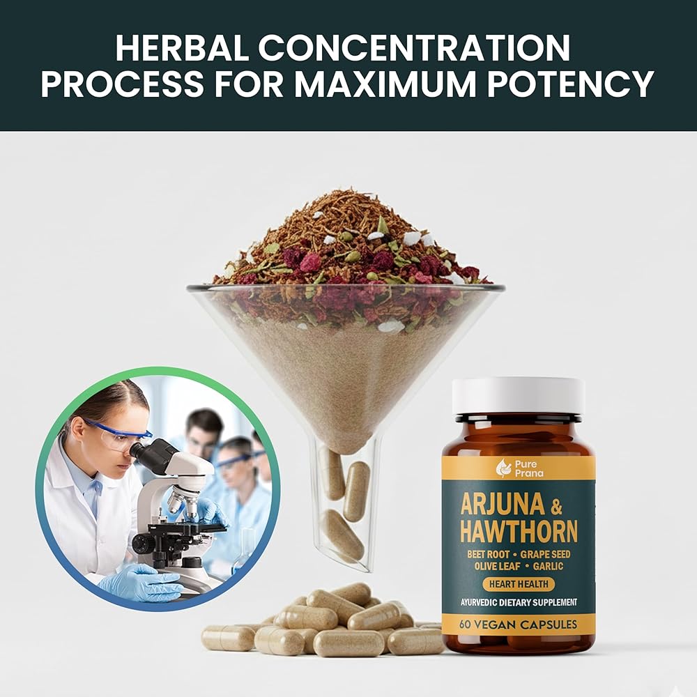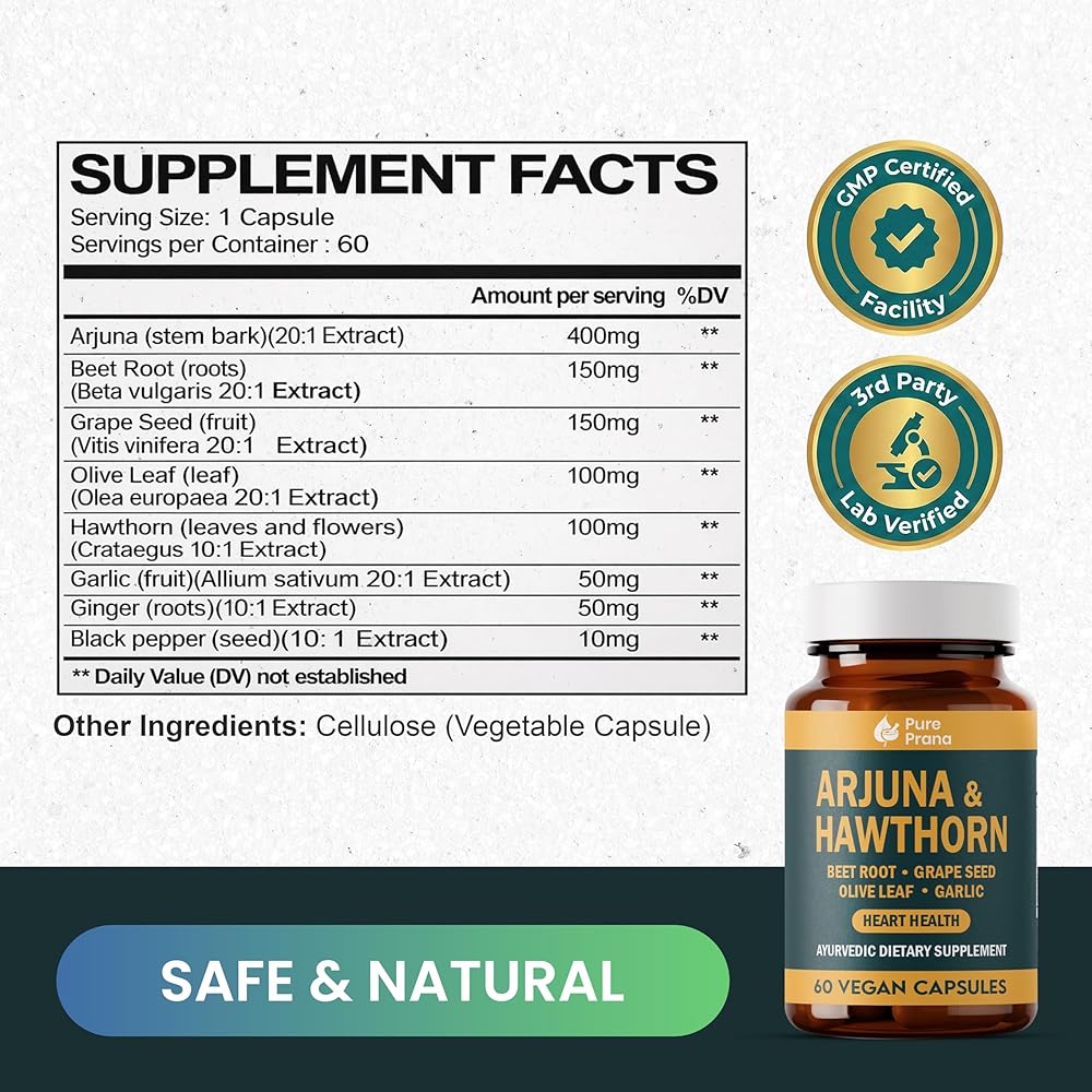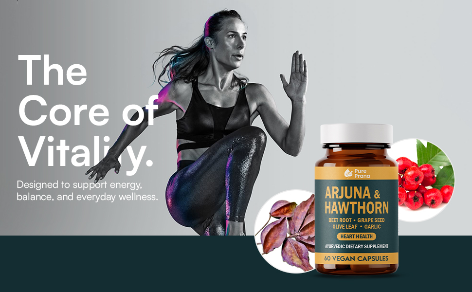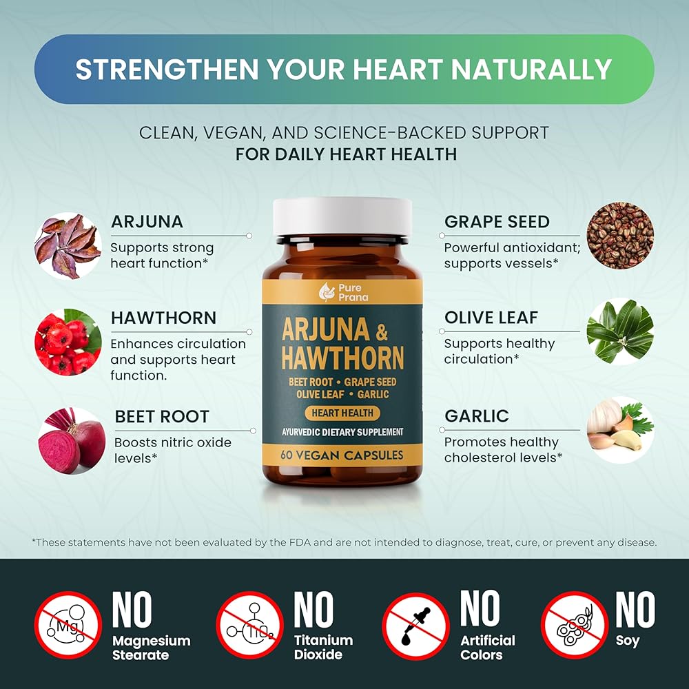 مكمل صحة القلب برانا الأيورفيدا النقي - لحاء الأرجونا والزعرور مع مرافق الإنزيم Q10، وجذور البنجر وبذور العنب لدعم القلب والأوعية الدموية وضغط الدم - كبسولات نباتية - غير معدلة وراثيًا، وخالية من الغلوتين