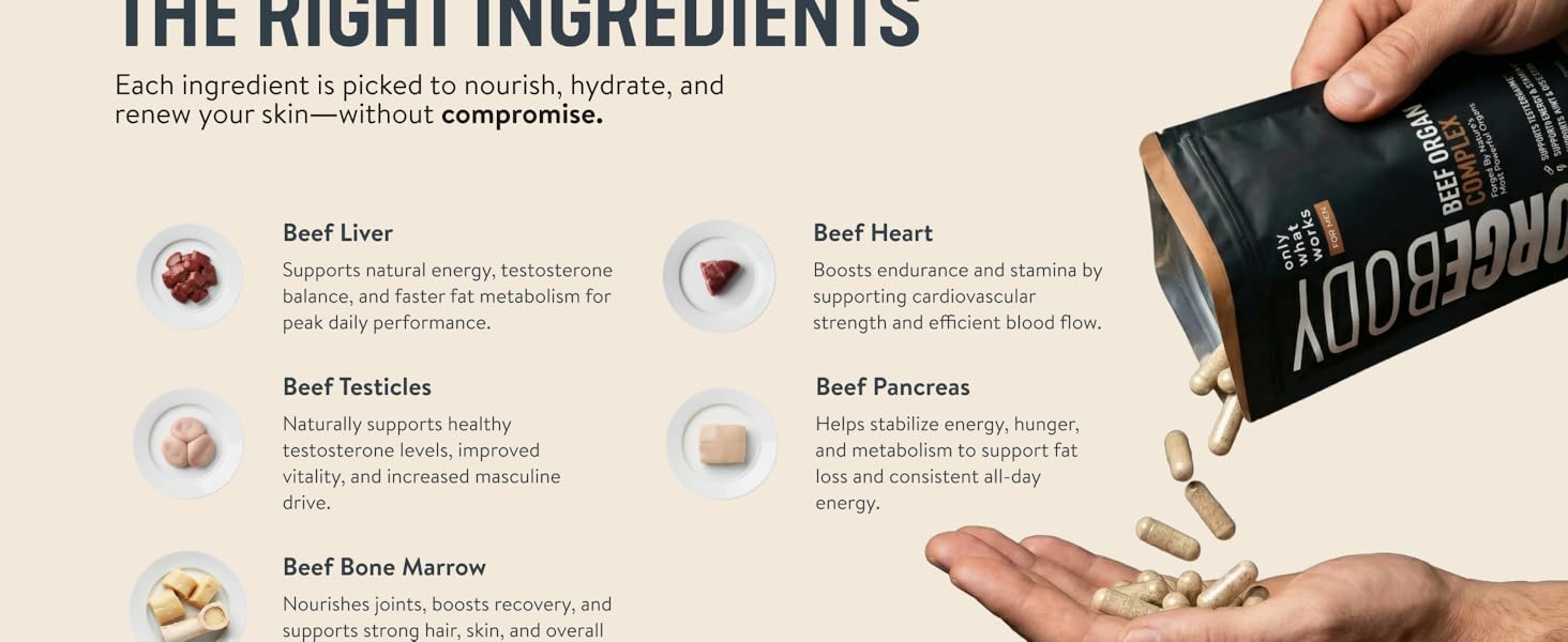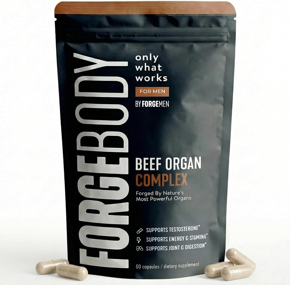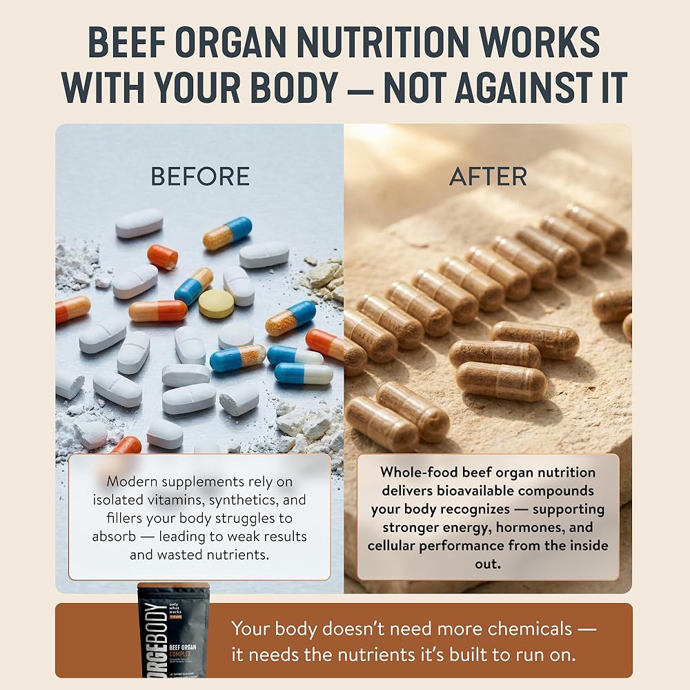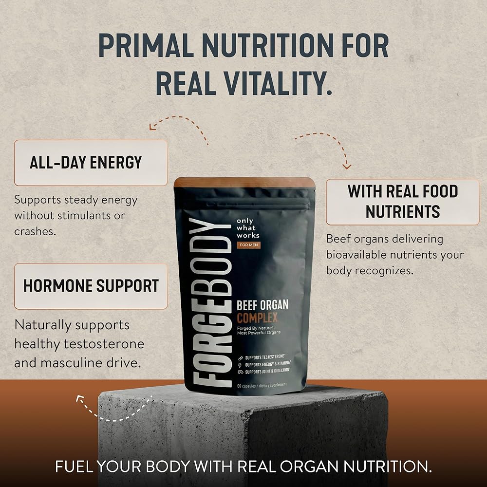 كبسولات FORGEBODY® لأعضاء لحم البقر [شهر واحد] - 100٪ مكمل لأعضاء لحم البقر الذي يتغذى على العشب مع مزيج من الكبد والقلب ونخاع العظام والبنكرياس والخصيتين - يدعم صحة الجسم ووظيفة الدماغ (غير معدل وراثيًا)