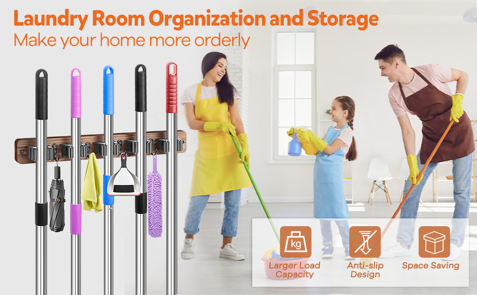 التنظيم والتخزين: سواء كنت تعلق المكانس أو المماسح أو المرايل أو أقمشة التنظيف أو غيرها من العناصر المختلفة، فإنها توفر طريقة بسيطة وفعالة للحفاظ على المساحة الخاصة بك مرتبة. يمكنك بسهولة تنظيم منزلك، مثل غرفة الغسيل والمطبخ والخزانة ومخزن المؤن والقبو وغيرها من المساحات الصغيرة