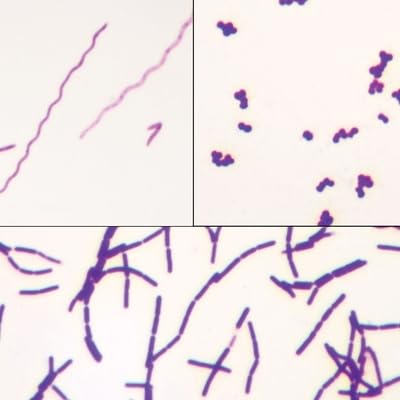 Have students explore the 3 typical forms of bacteria using 1 convenient slide. Includes separate smears of bacillus, coccus, and spirillum bacteria. Learning bacteria morphology couldn't be easier! Slide shows Bacillus megaterium (bacillus, Gram positive), Micrococcus luteus (coccus, Gram positive), and Rhodospirillum rubrum (spirillum, Gram negative).