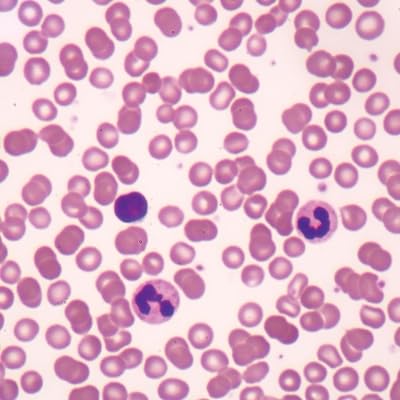 Human Blood Film Slide, Smear, Wright's Stain. Give your students an up-close look at human blood cells using Carolina's most popular prepared blood microscope slide. The blood smear is stained with Wright's stain, allowing students to easily distinguish between red and white blood cells. Erythrocytes (red blood cells) are the plentiful, pink cells in the smear. Leukocytes (white blood cells) are larger cells with a purple nucleus. Based on the shape and size of the nucleus in the white blood cells, students can classify them as neutrophils, eosinophils, basophils, lymphocytes, or monocytes. In addition, students can identify platelets in the smear; these are also pink cells but are much smaller than the numerous red blood cells.