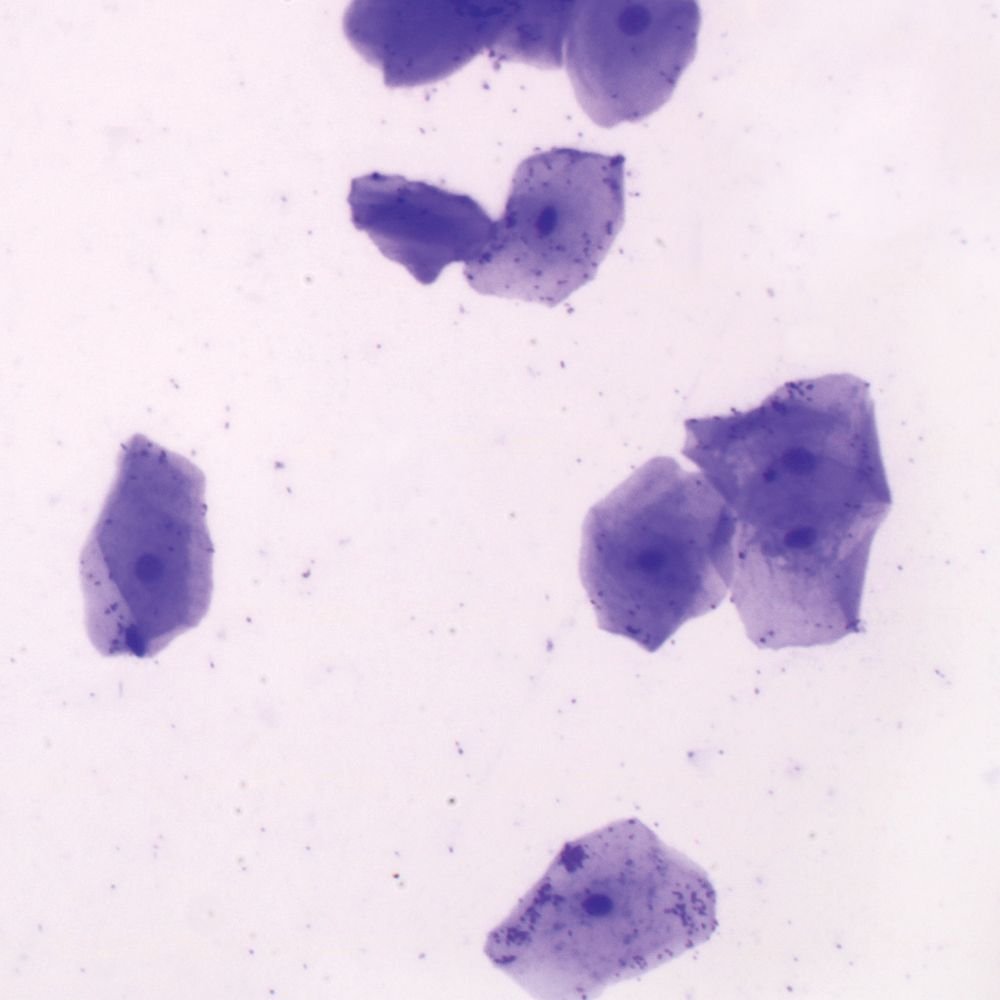 Human Stratified Squamous Epithelium Slide, Smear Use the isolated cheek cells on this prepared slide to illustrate the morphology of typical squamous cells. The lining of the human mouth is a standard example of stratified squamous epithelium. The flat cells shown on the slide form several layers that make up this type of epithelial tissue. Epithelial tissue covers or lines body surfaces as well as serving to absorb, filtrate, protect, and secrete various substances. The tissue is classified by the number of cell layers it has (simple=1 cell layer, stratified=more than 1 cell layer) and the shape of the cells (squamous=flat, cuboidal=cube-shaped, columnar=column-shaped).