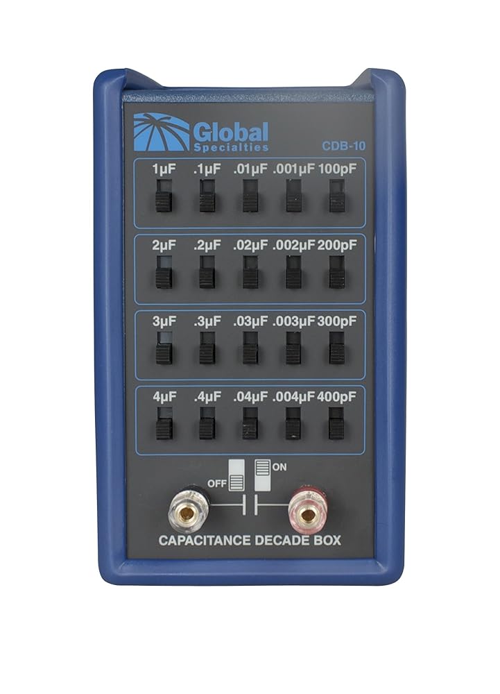Model CDB-10 is a hand held Capacitance decade box that creates a specific capacitance value using a combination of switches. Designed with accuracy to meet the needs of industry and education alike. The CDB-10 is a compact, convenient tool for aiding in engineering design and testing as well as calibration of test equipment. It offers 5 decades of capacitance ranges, from 100 pF to over 11 microfarad in 100 pF steps. Easy-to-use slide switches allow for straightforward addition and subtraction of capacitor values. CDB-10 is a passive device that requires no power source. The unit is housed in a rugged handheld enclosure with an impact resistant rubber boot. Select capacitance in series or in parallel combinations. Calibrate test equipment with its high accuracy of 5 percent. 20 switches organized in a clean 4 by 5 grid for easy use. Includes a protective rubber holster with tilt-stand for ease of use and viewing. Set at any capacitance value from 100 pF to over 11 microfarad in 100 pF increments. Input terminals accept standard banana plugs, bare wires, spade lugs or alligator clips. Determine impedance, reactance and frequency characteristics. Vary capacitance levels in circuitry design, ie: oscillators, filters, timing circuits, impedance matches, rectifiers, and other RF circuits. Internal residual cap: 50 pF maximum. Voltage limit: 50 VDC (non-polarized capacitors). Connection: two (2) binding post. Accuracy: 5 percent (1 microfarad: 100 Hz test freq). Operating conditions temperature: 32 to 122 F. Humidity: