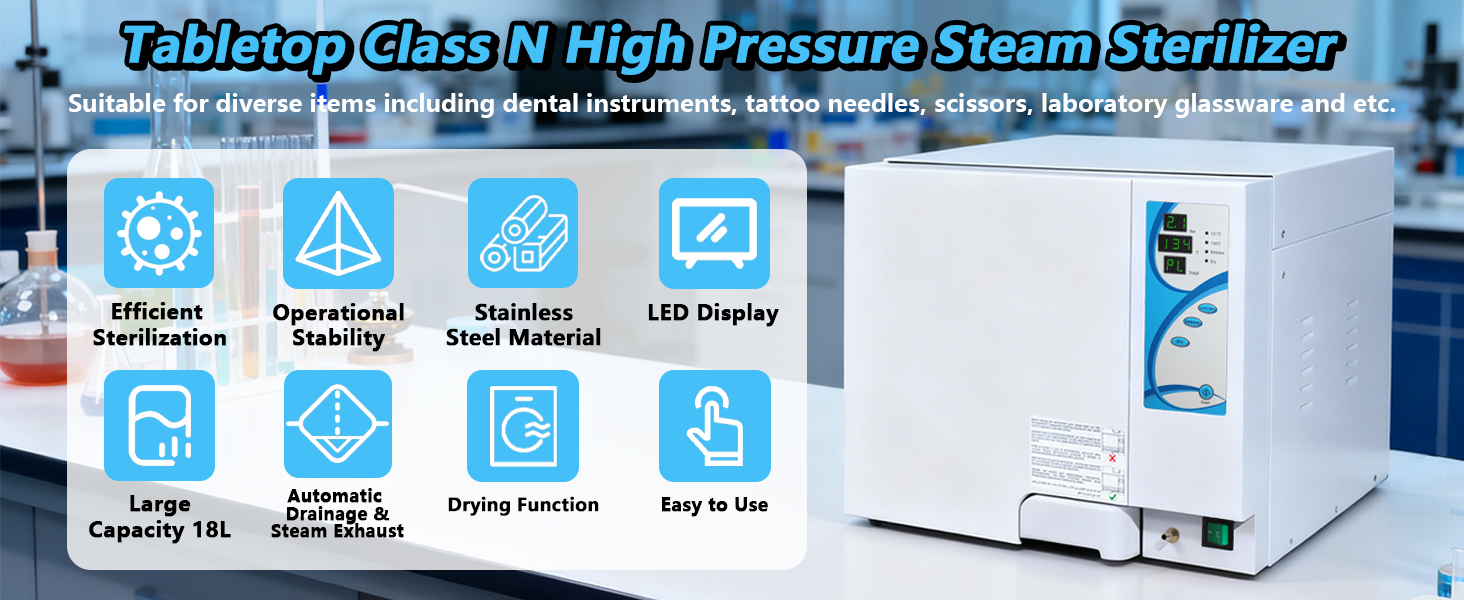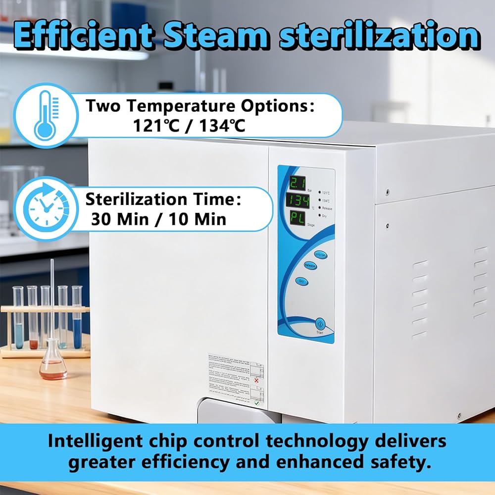 【معقم تلقائي فعال】يعمل جهاز التعقيم بالبخار عالي الضغط من الفئة N بقوة 1500 وات، مما يوفر عملية سهلة الاستخدام وذكاءً محسنًا. فهو لا يراقب ضغط عمل الوحدة ودرجة الحرارة في الوقت الفعلي فحسب، بل يسمح لك أيضًا بضبط المدة بعد البرنامجين المضبوطين مسبقًا (121 درجة مئوية/30 دقيقة و134 درجة مئوية/10 دقائق) وفقًا لمتطلباتك المحددة، مما يوفر نتائج سريعة وفعالة.