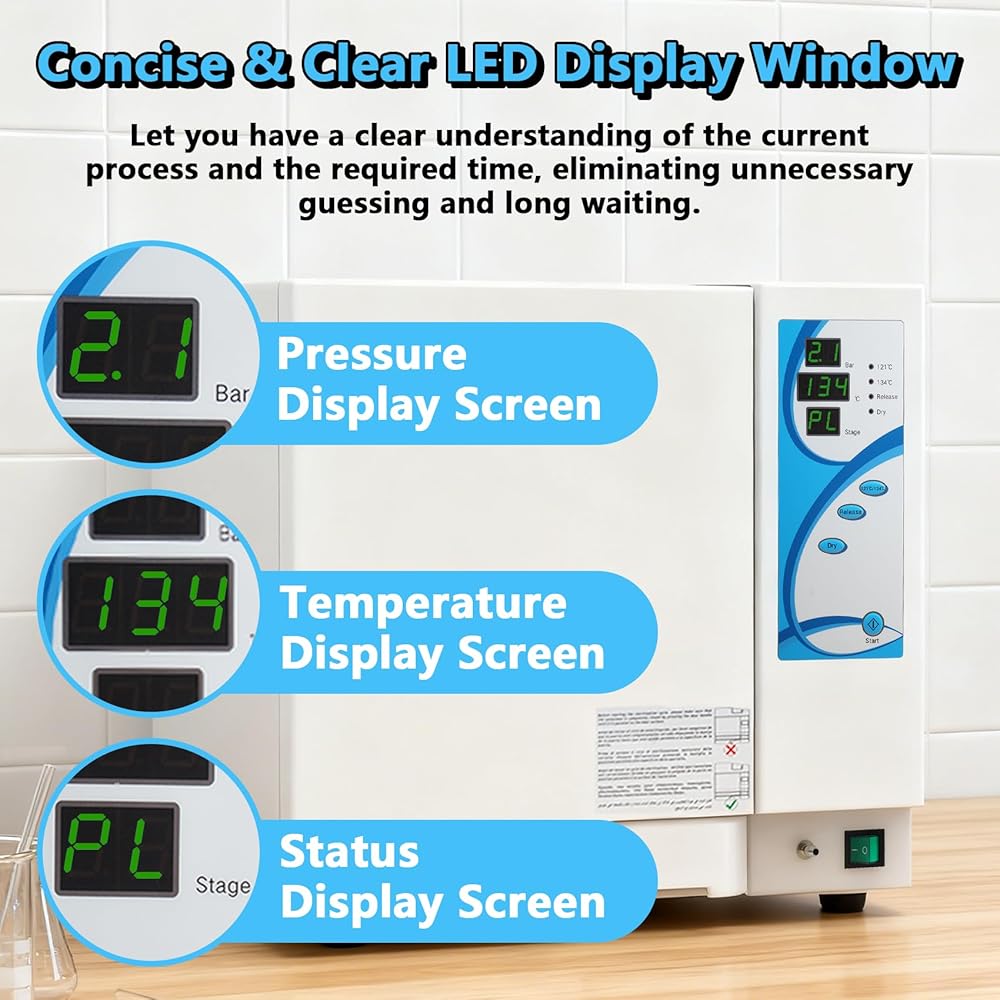 【نافذة عرض LED موجزة وواضحة】يحتوي معقم الأوتوكلاف هذا على ثلاث شاشات LED بسيطة وواضحة، تتوافق مع الضغط ودرجة الحرارة وحالة معقم الأوتوكلاف أثناء التعقيم. يتيح لك ذلك فهم العملية الحالية والوقت المطلوب بوضوح، مما يزيل التخمين غير الضروري والانتظار الطويل. مع كل شيء تحت سيطرتك، يصبح انتباهك حرًا للتركيز على أشياء أكثر أهمية، مما سيزيد من كفاءتك بشكل كبير.