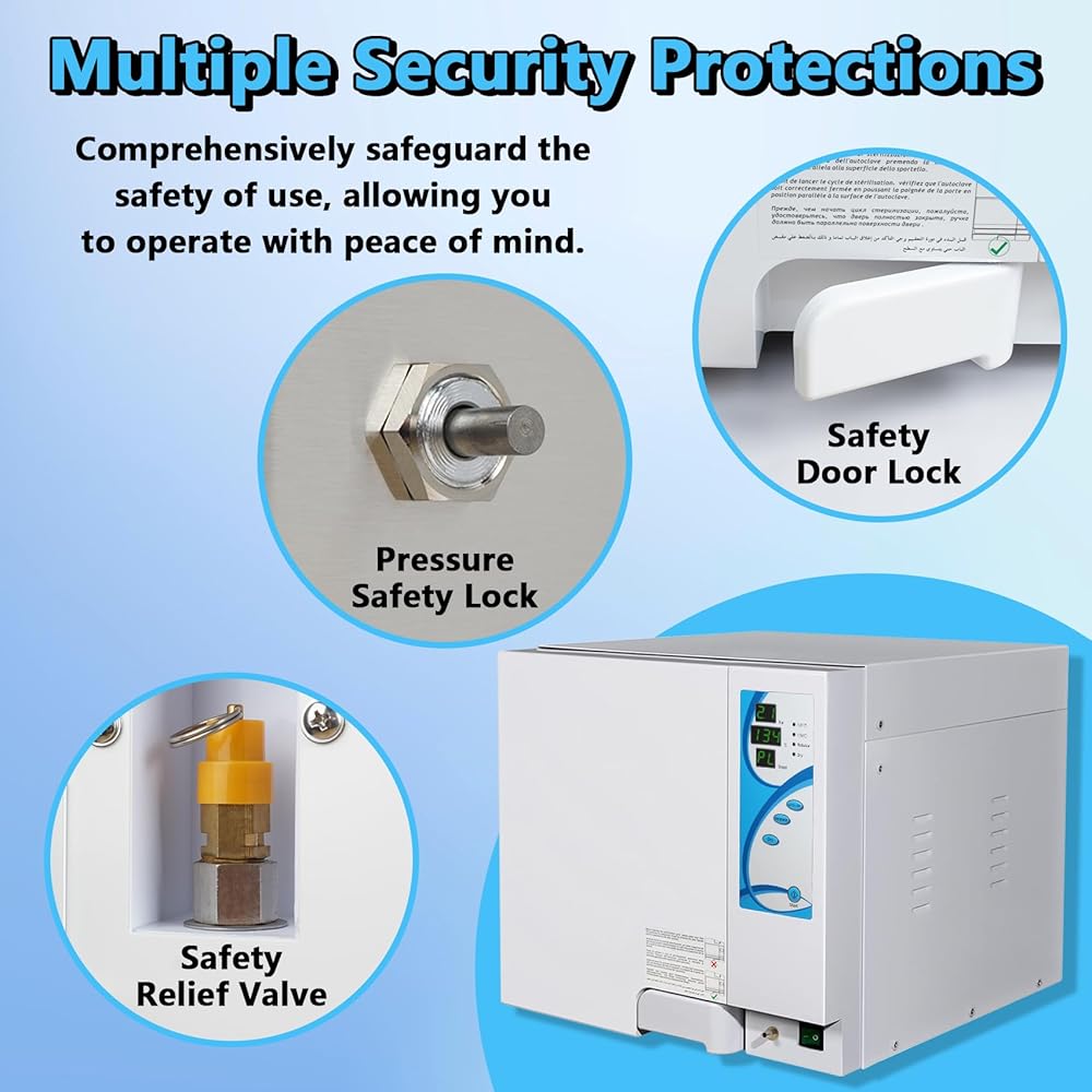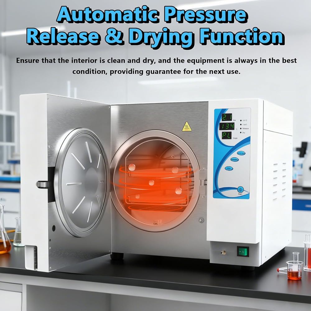 وظيفة تحرير الضغط والتجفيف التلقائي: بعد الانتهاء من العمل، سيطلق معقم الأوتوكلاف هذا تلقائيًا الضغط الداخلي ويفرغ الماء والبخار بالداخل، مما يضمن سلامة المعدات. يحتوي معقم الأوتوكلاف هذا أيضًا على وظيفة التجفيف، والتي يمكن أن تقلل بشكل فعال من دورة التجفيف وتحسن بشكل كبير تأثير التجفيف على المكونات الداخلية والغرف، مما يضمن أن يكون الجزء الداخلي نظيفًا وجافًا، وتكون المعدات دائمًا في أفضل حالة. تذكير لطيف: لضمان الجفاف الداخلي للمنتج، نوصي بمسح أي بقع أو علامات مياه متبقية بمنشفة نظيفة وجافة بعد الانتهاء من الدورة.