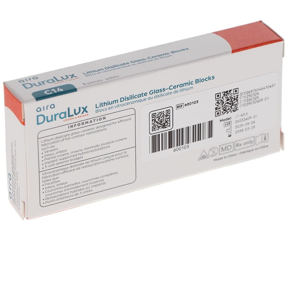 Aira 600103 DuraLux IPS e.max Type Blocks CAD inLab LTA3.5 C14 5/Pk. . The Aira IPS e.max Type CAD blocks are composed of reliable lithium disilicate glass-ceramic, well-known for providing an exceptional balance between high flexural strength and natural, tooth-like esthetics. This particular block configuration is carefully engineered to achieve the optimal combination of opacity and natural appearance required for full-contour restorations like crowns and veneers.