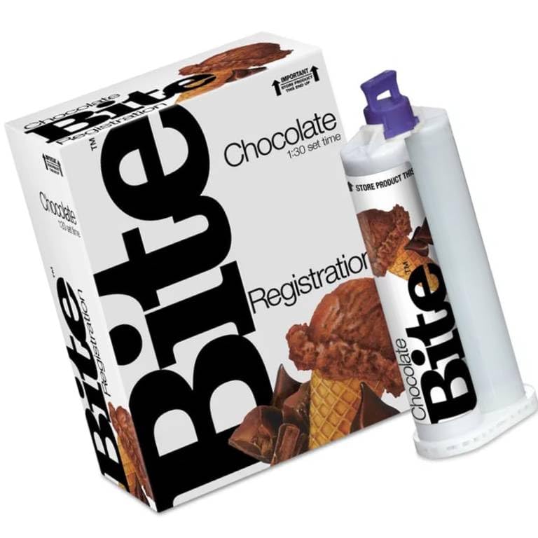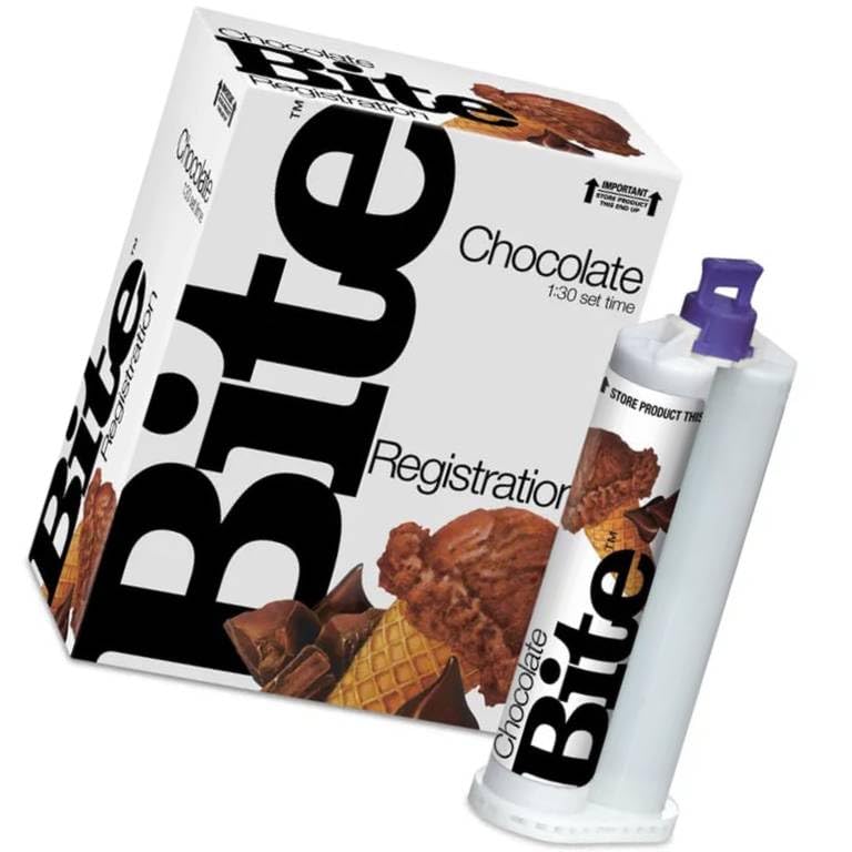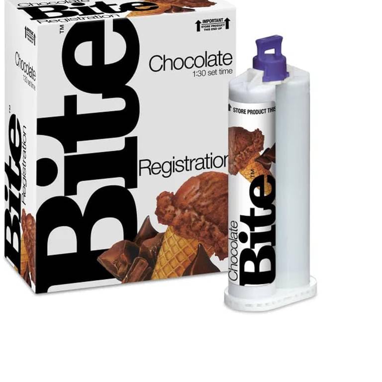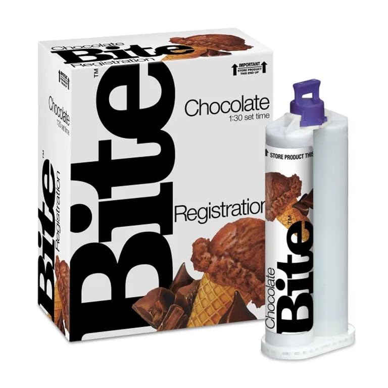Chocolate Bite Registration Material, Fast Set Kit - 2 x 50 Gm. Cartridges & 10 Mixing Tips. Min working time: 45 seconds. Medium viscosity. Slower set time allows full-arch registrations with exceptional rigidity, stability, and a milk chocolate scent. Slower set time: 1:30 minutes for longer working time.