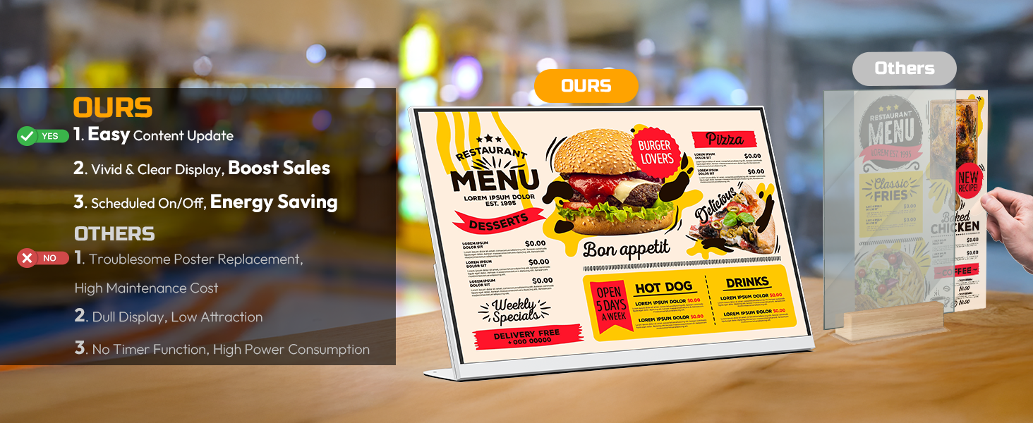 【تطبيق متعدد المشاهد】يعمل كقائمة إلكترونية وشاشة إعلانية ولافتات، مما يساعد على تحسين صورة العلامة التجارية والكفاءة التشغيلية.